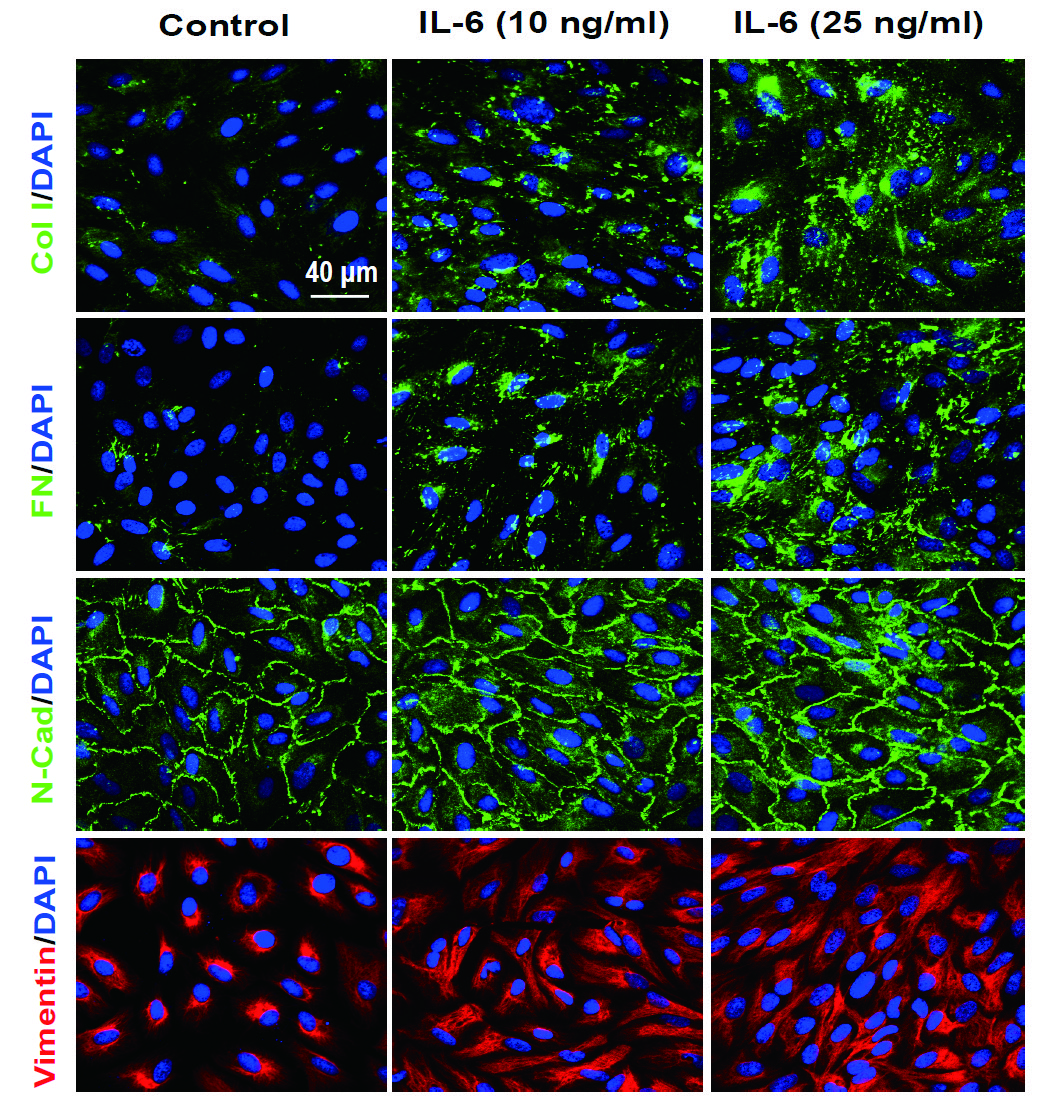 after RPE cells were exposed to 10 and 25 ng/ml of interleukin-6 (IL-6) for 48 h. Scale bars: 40 μm.