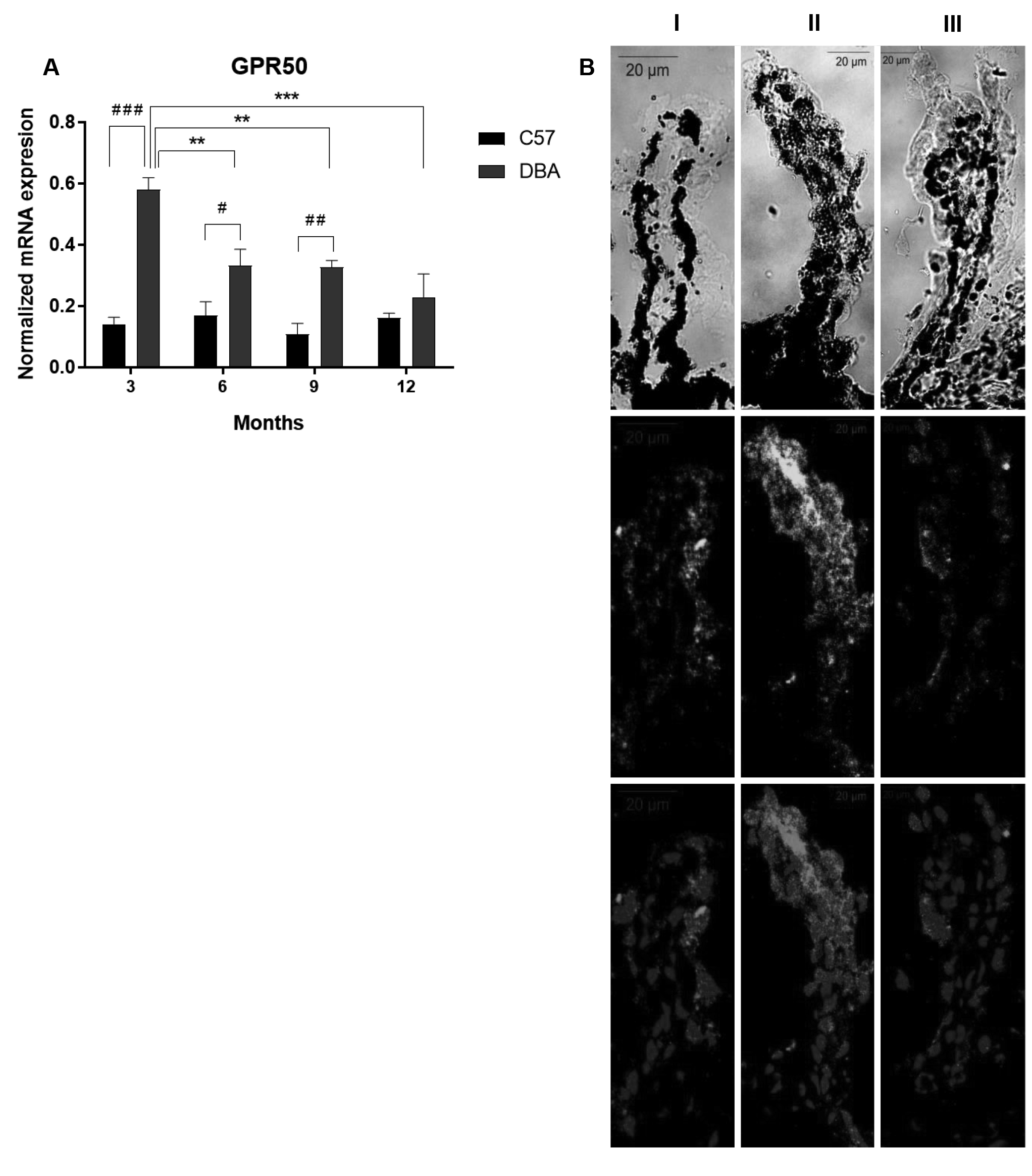 mean ± standard error of the mean (SEM) of 24 animals of each strain (*p<0.05, ***p<0.001 versus the same mouse strain; #p<0.05, ###p<0.001 versus a different mouse strain; one-way analysis of variance (ANOVA) with Dunnett’s multiple comparisons test). B: Immunofluorescence images of the ciliary processes from 3-month-old C57BL/6J (I), 3-month-old DBA/2J (II), and 12-month-old
