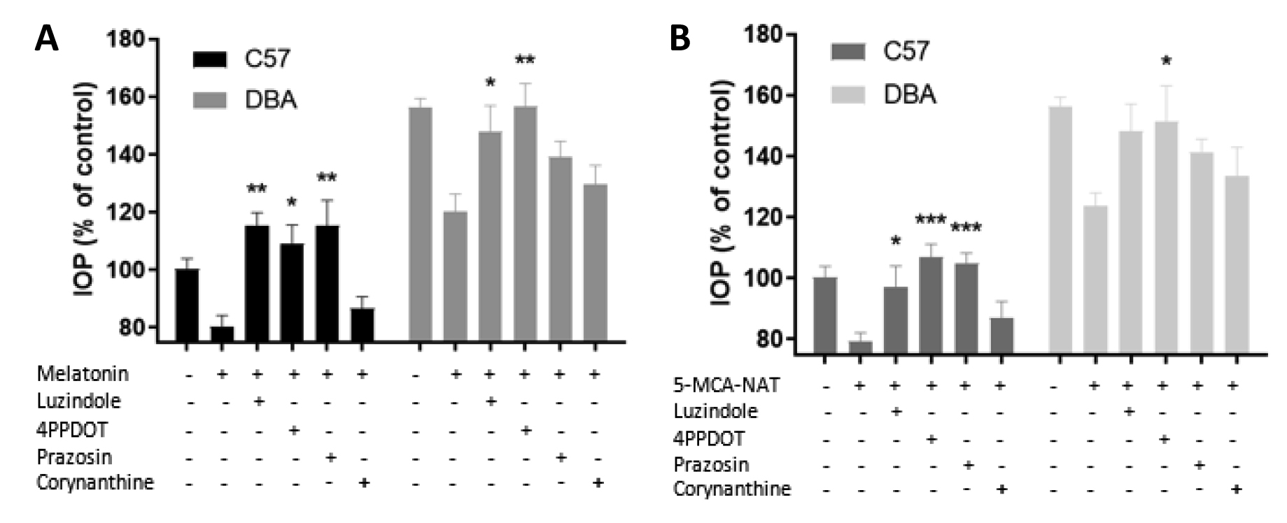 Figure 4. Effect of melatonin receptor antagonists on IOP reduction mediated by melatonin and 5-MCA-NAT in C57BL/6J (dark bars) versus