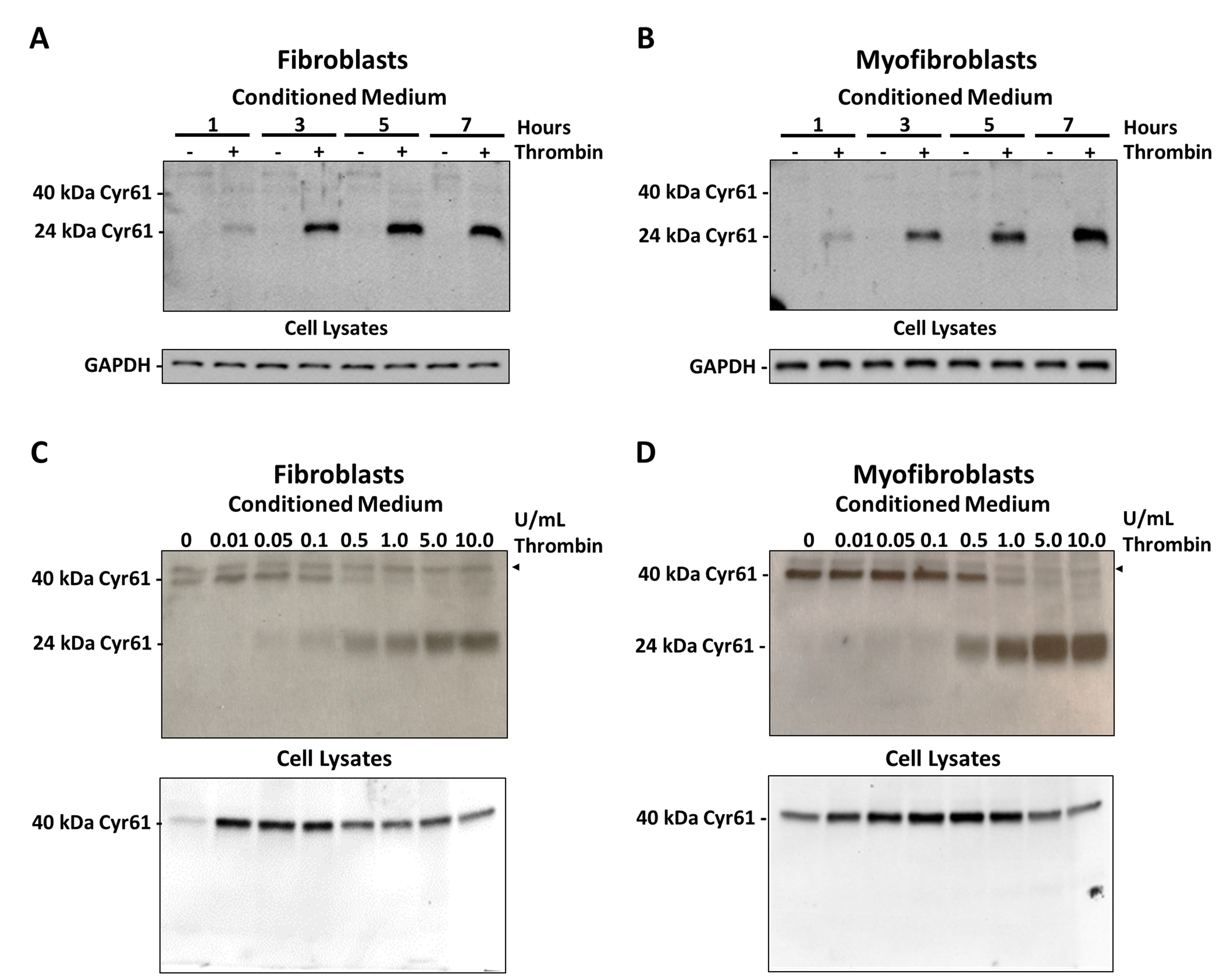 D). Conditioned media and cell lysates were collected, processed, and evaluated via western blot analysis for Cyr61 using an