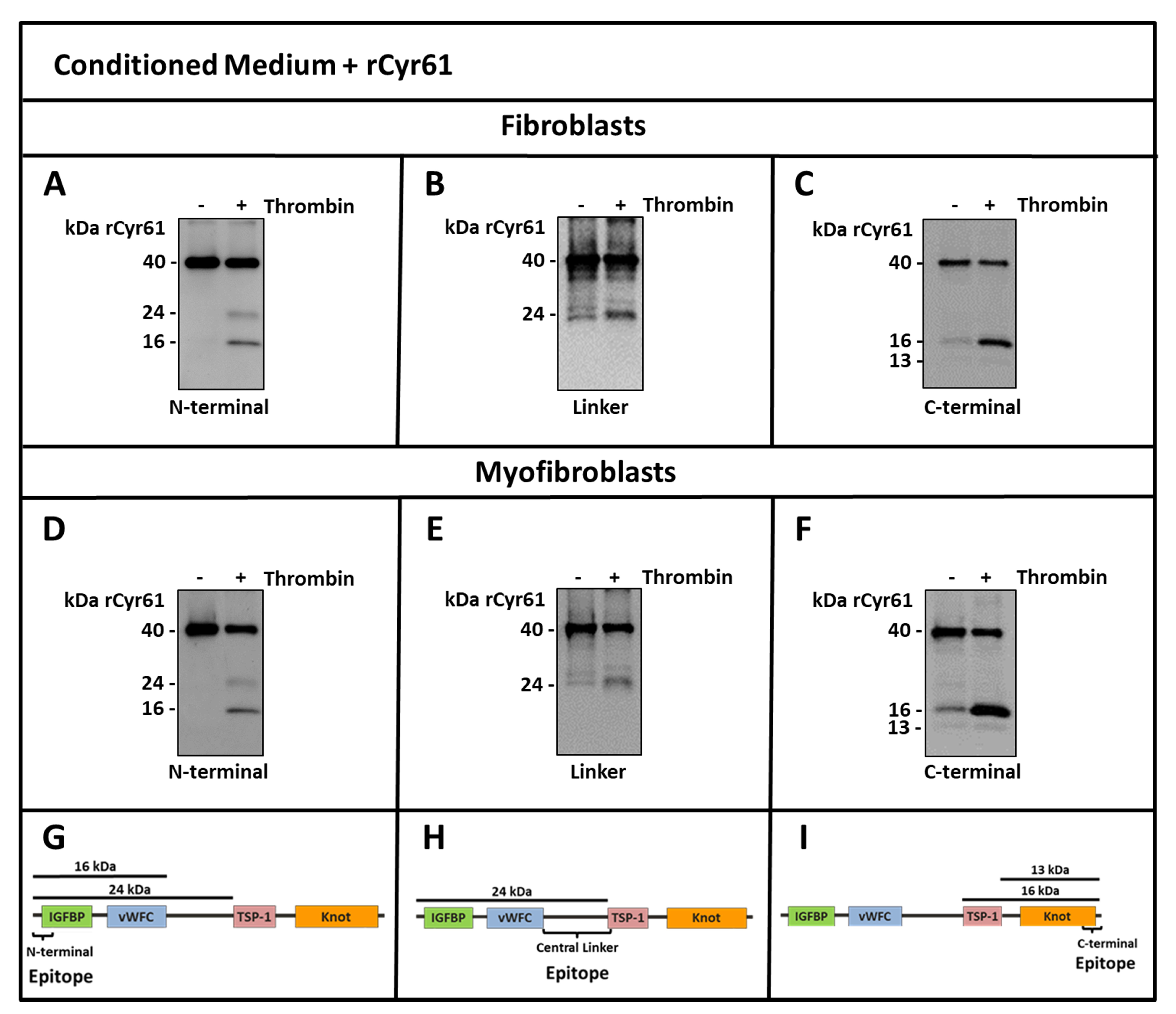 of two experiments using independent donors. G-I: Approximate location of cleavage products based on epitope locations of Cyr61 antibodies.