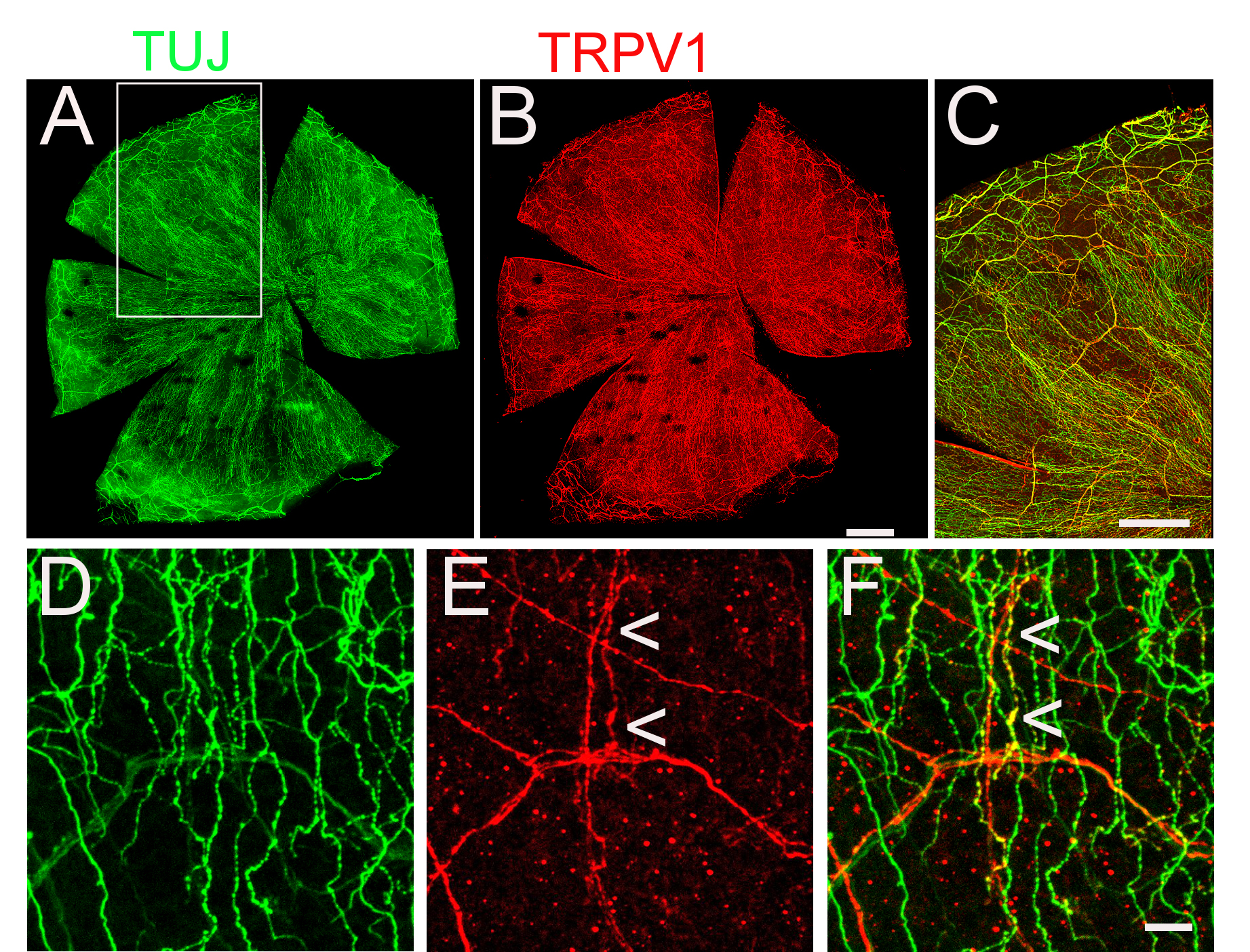 Figure 1. TRPV1 is expressed in axons throughout the cornea. A, B: Neuronal β-tubulin (TUJ) and TRPV1 antisera labeled axons in a mouse cornea wholemount. C: Merged section from the wholemount in A, B (boxed area in A) demonstrating many of the axon fiber bundles entering the cornea express TRPV1. D–F: Three-dimensional x,y projection from the sub-basal level to the cornea surface; arrowheads point to small-diameter fibers