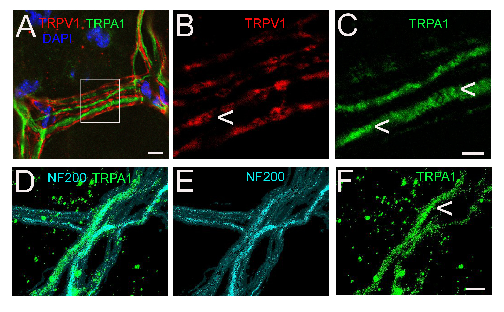 Figure 2. TRPV1 and TRPA1 are in separate axons in the cornea. A–C: TRPV1 and TRPA1 antisera labeled axons in the stromal region of the cornea. Boxed region of A is shown in B, C. D-F: TRPA1 and NF200 immunolabeling colocalize to the same axons. Arrowheads indicate punctate, intracellular immunostaining