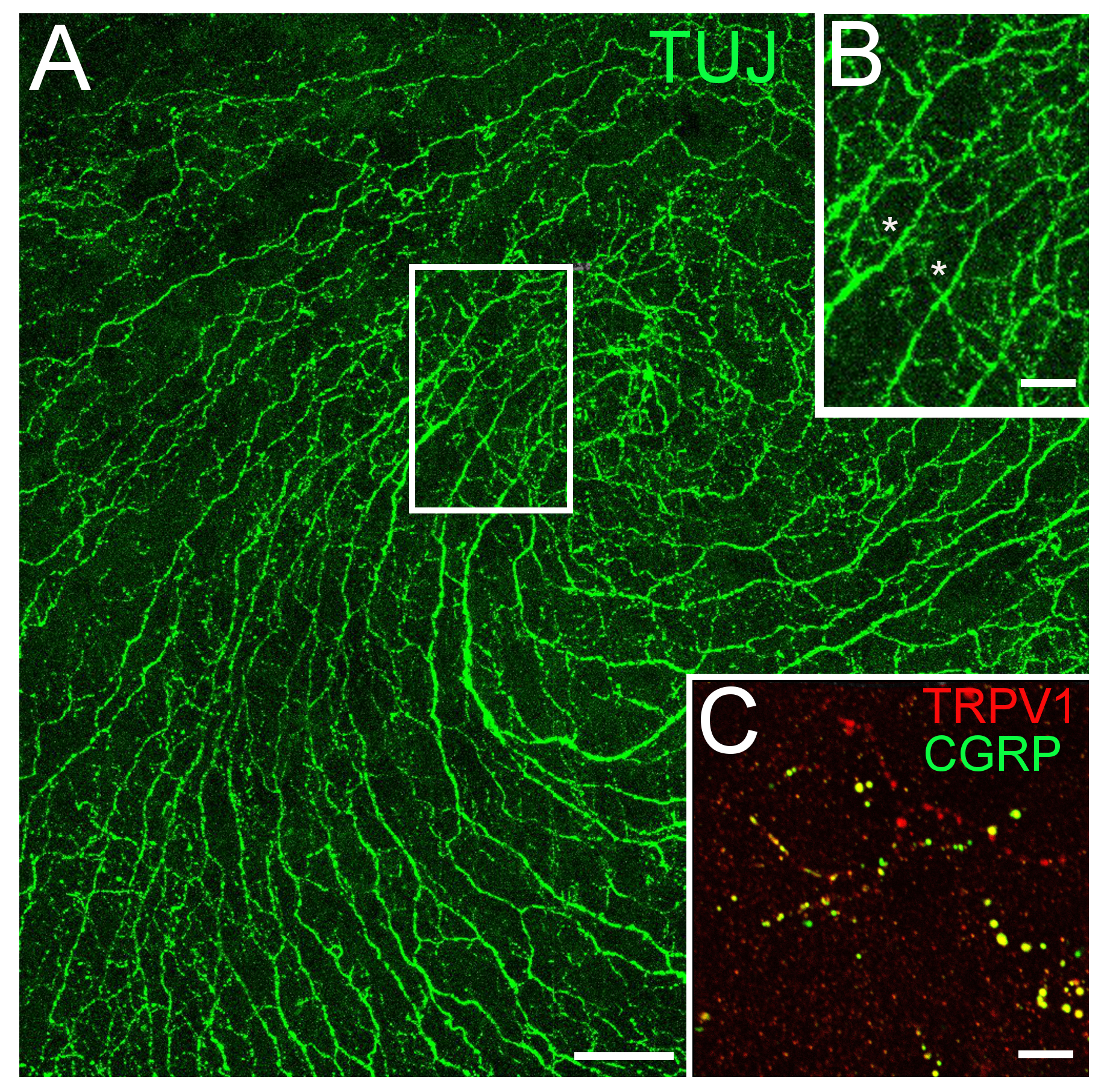 Figure 6. TRPV1 and CGRP are expressed in epithelial C fibers in the monkey cornea. A: Neuronal β-tubulin (TUJ) immunolabeling of monkey wholemount cornea. B: Boxed area of A, small-diameter C fibers extending to the surface (asterisks). C: TRPV1 and CGRP are expressed in C fibers at the corneal surface. Scale bars: (A) 50 μm; (B) 20 μm; (C) 5 μm.