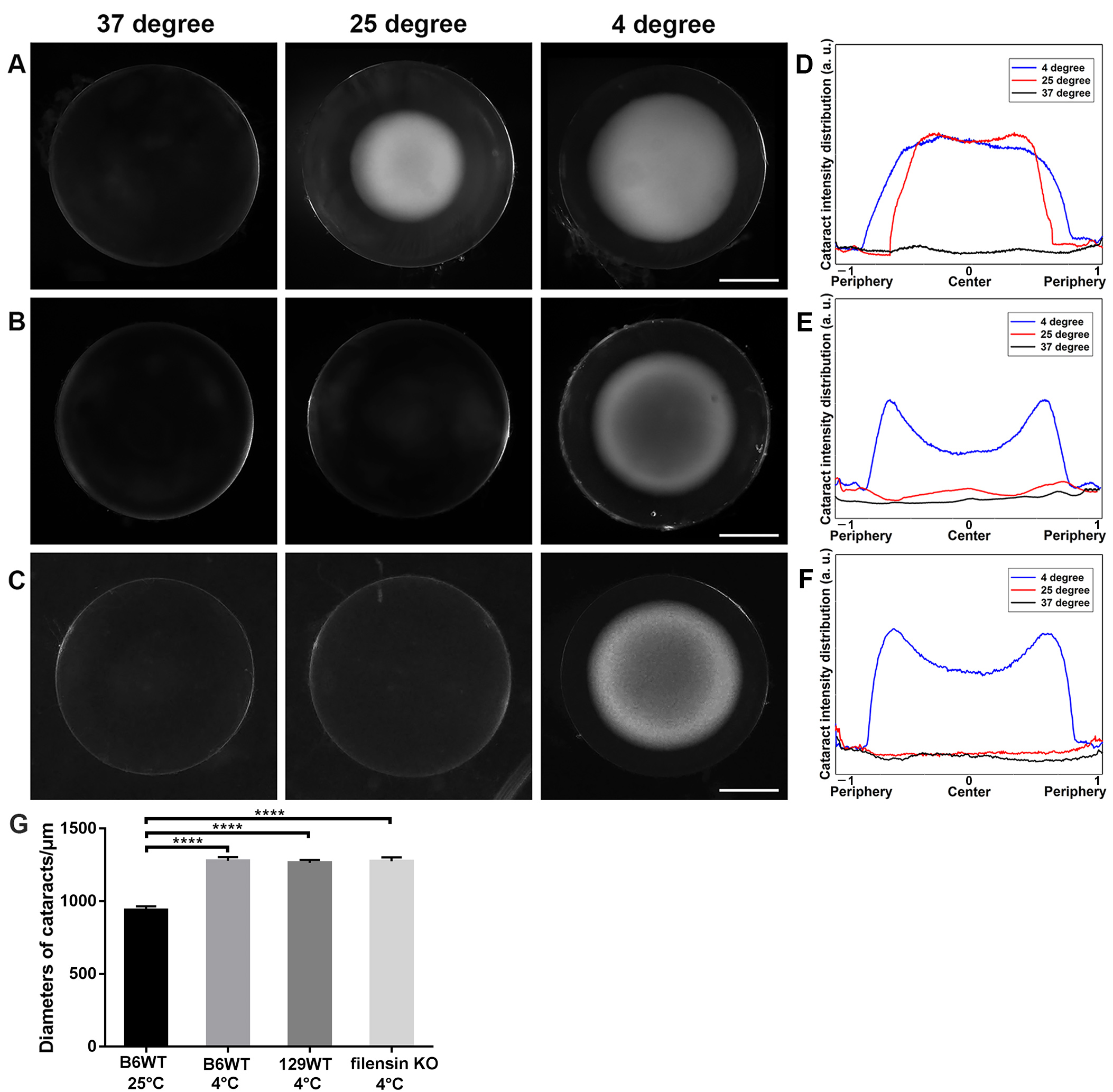 red line for 25 °C, and the black line for 37 °C in the B6WT (D), 129WT (E), and B6 filensin KO (F) lenses. Bar graphs show a statistic comparison of the diameters of the cold cataracts (G). The 25 °C induced cold cataract is statistically significantly smaller than all 4 °C induced cold cataracts (n = 4, ****p≤0.0001).