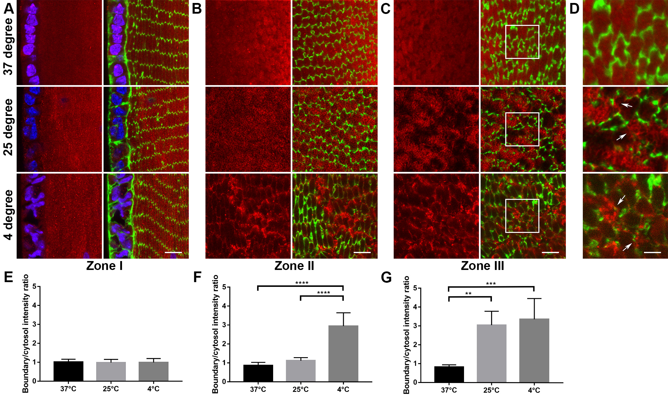 F: However, the CP49 boundary/cytosolic intensity ratio in the 4 °C treated fibers was statistically significantly higher than