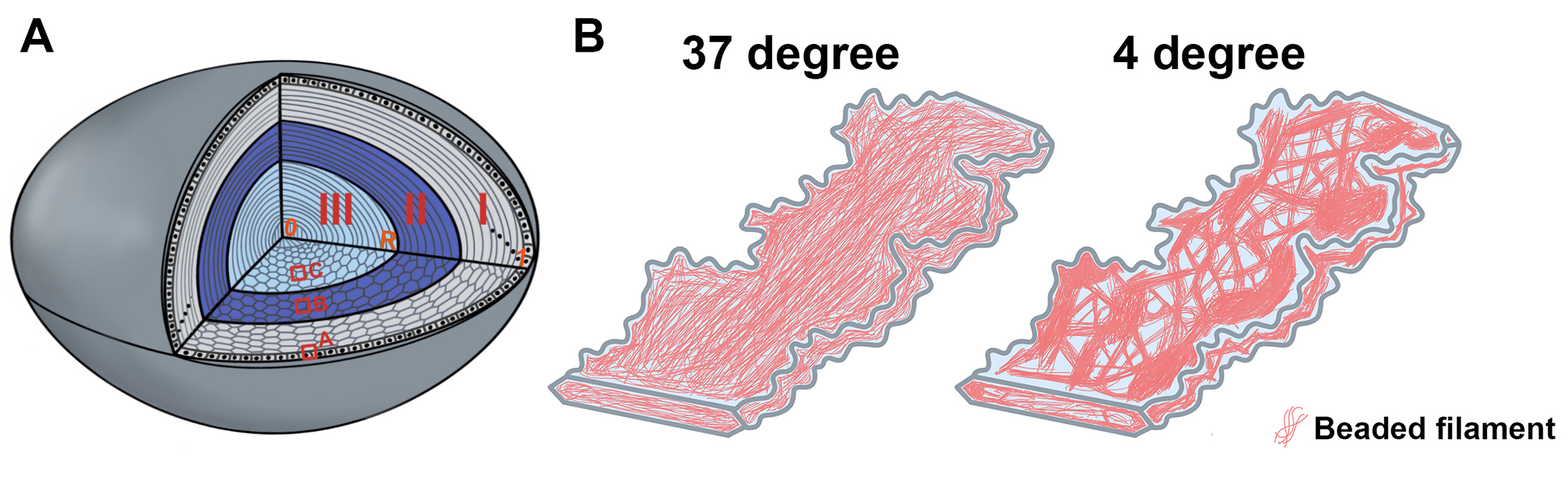 B: An interior hexagonal fiber cell model shows the change in the CP49 and filensin beaded intermediate filaments from uniform