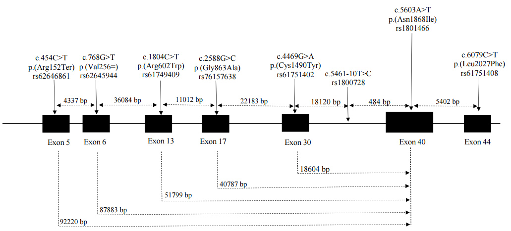 c.1804C>T, c.2588G>C, c.4469G>A, c.5461–10T>C, and c.6079C>T, as well as the variant of interest in this study, c.5603A>T.