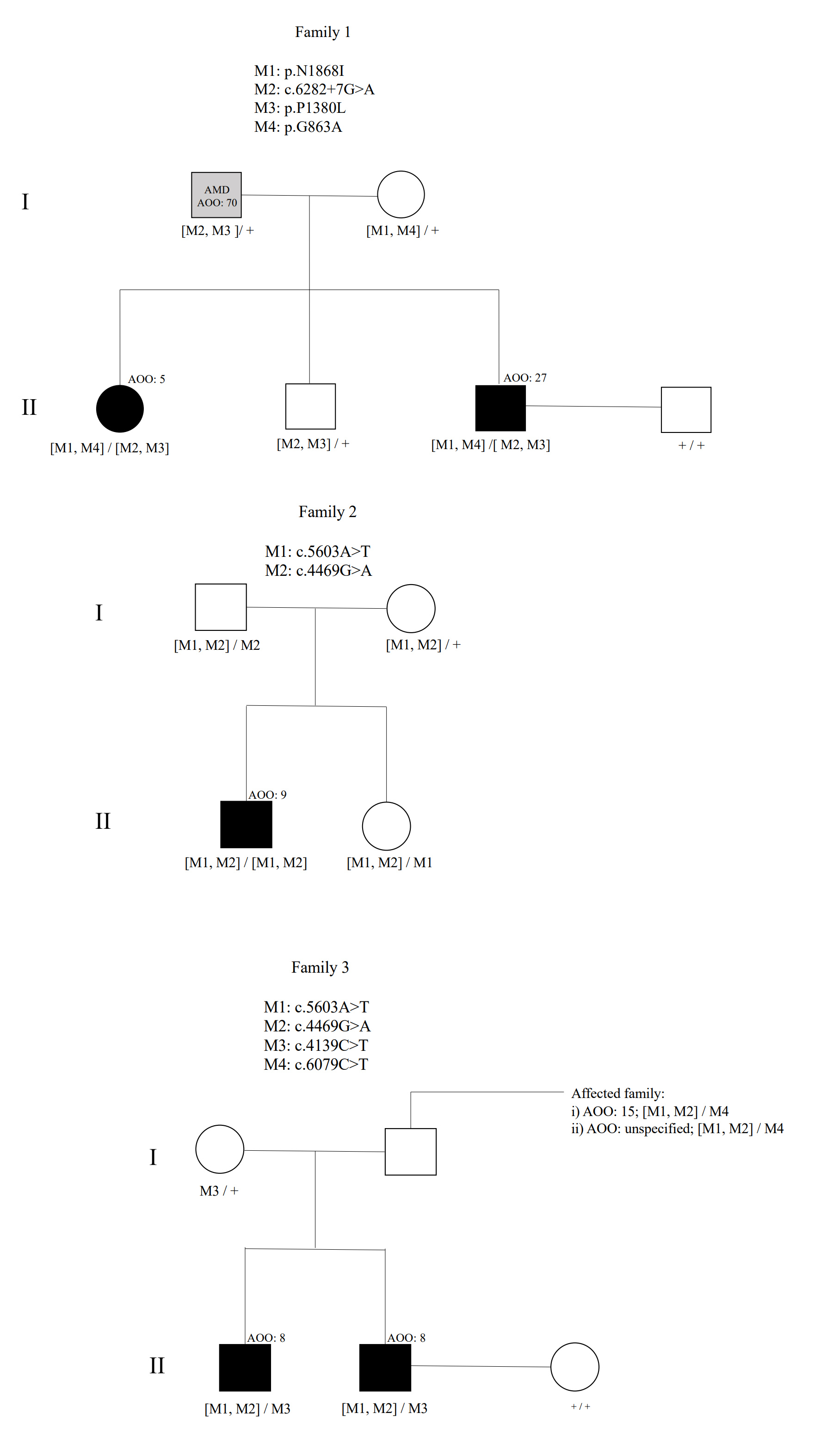 Example pedigrees overlaid with disease, genotype, and AOO information used for cosegregation analysis.