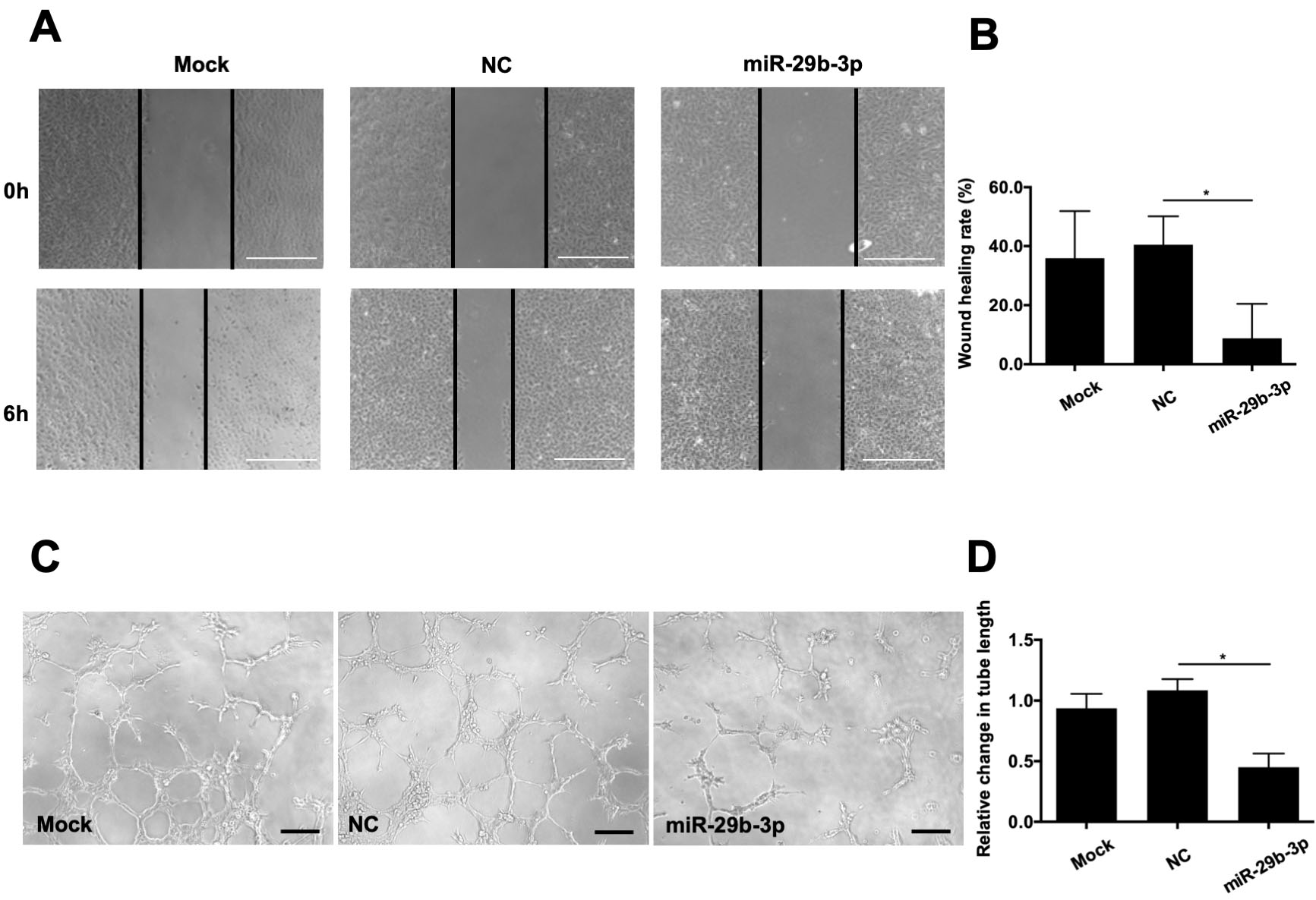 on Matrigel. Scale bar: 100 µm. D: Statistical analysis of the relative change in tube length revealed that transection with miR-29b-3p-mimic statistically