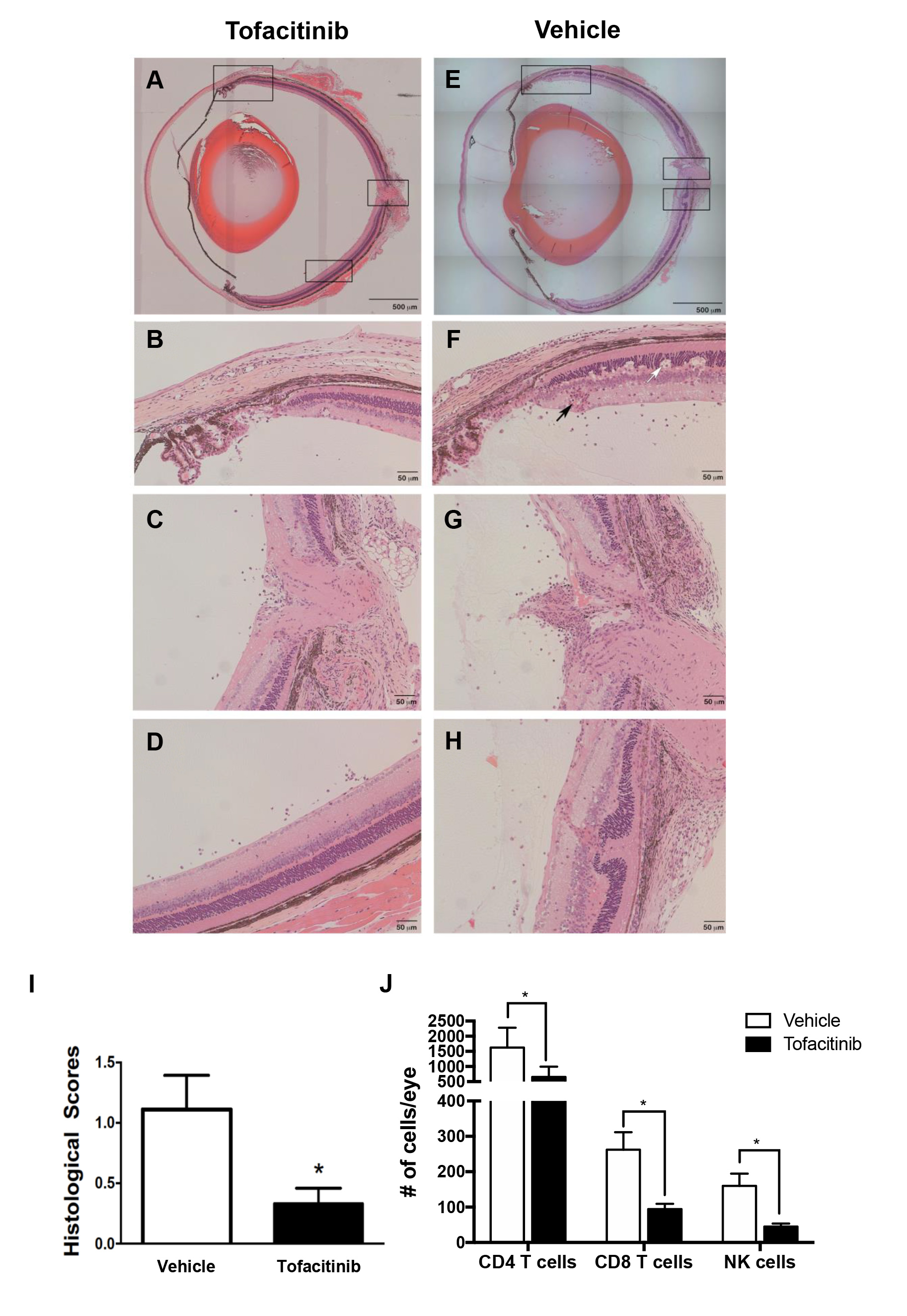 tofacitinib significantly inhibited the development of disease. J: The actual numbers of CD4+ and CD8+ T cells, as well as NK cells (CD3-NK1.1+) in the eyes of the immunized mice treated with vehicle or tofacitinib. The means ± standard error of the mean (SEM) from