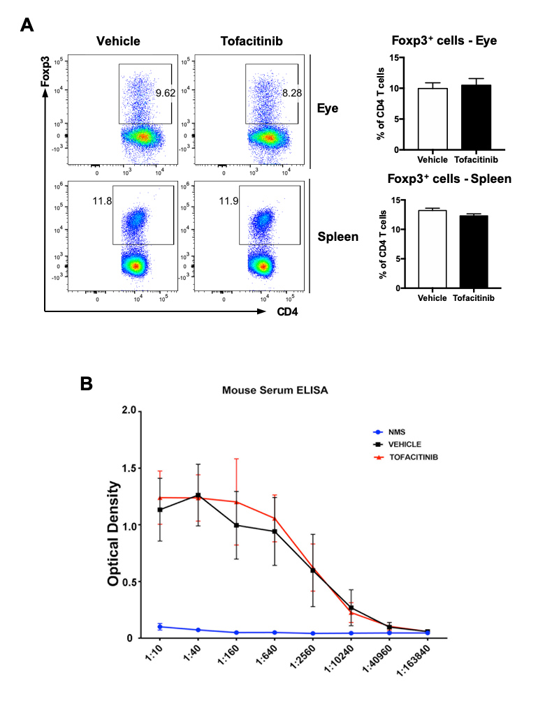 Figure 6. Treatment with tofacitinib has no apparent effect on the generation of FoxP3+ cells and on antibody production to IRBP. A: Eye-infiltrating and splenic cells from mice treated with tofacitinib or vehicle-treated controls were collected on day