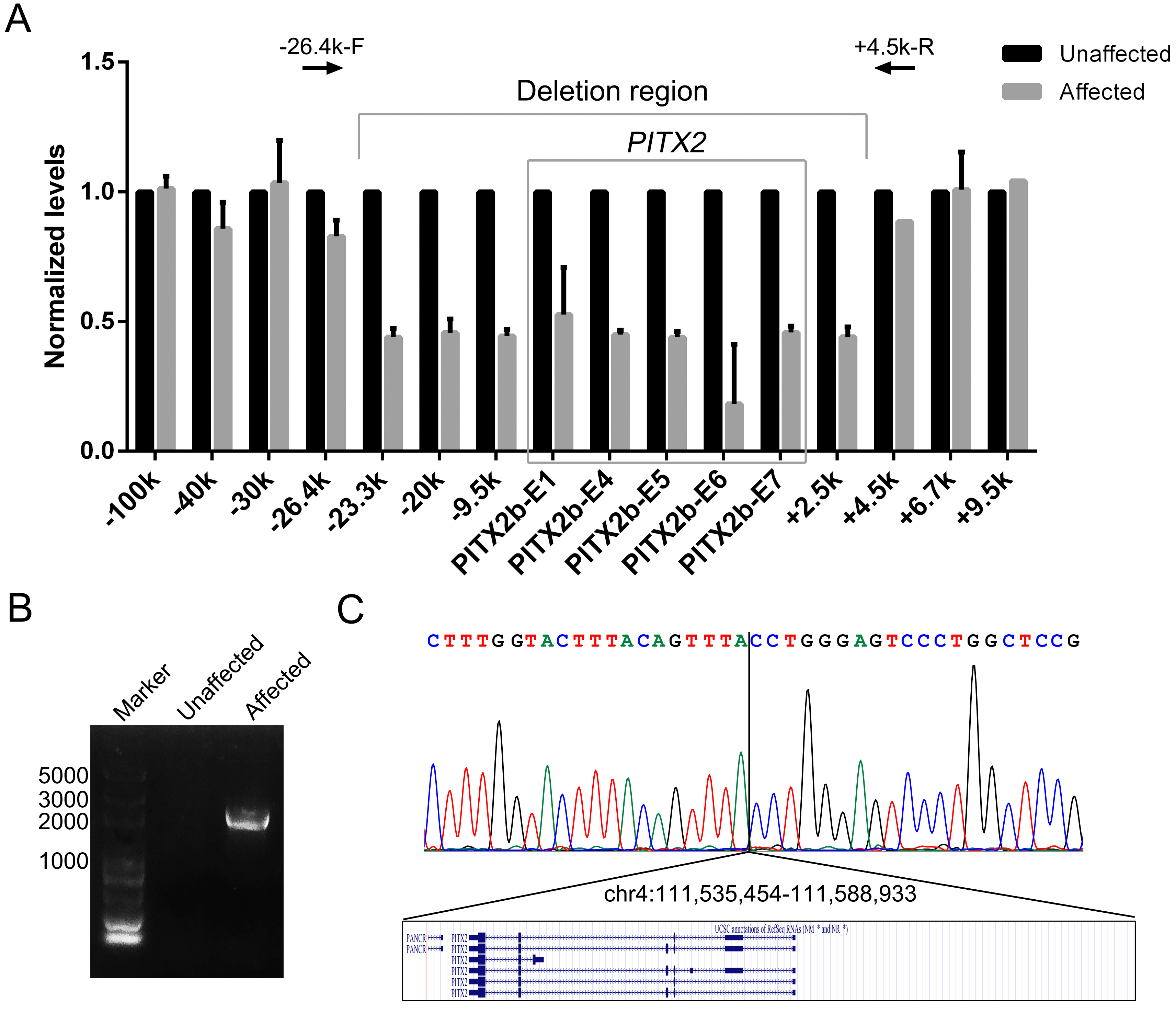 Figure 2. Identification of the large genomic deletion spanning PITX2 in the family. A: Confirming and mapping the deleted region around PITX2 with quantitative PCR (qPCR). The deletion was positioned between 26.4 kb upstream and 4.5 kb downstream of the PITX2 gene. B: The DNA fragment containing the breakpoint was amplified with long-range PCR using the −26.4k-F/+4.5k-R primers. C: The sequencing result of the DNA fragment above shows an approximate 50 kb deletion spanning the first exon of PANCR and the entire PITX2 gene.