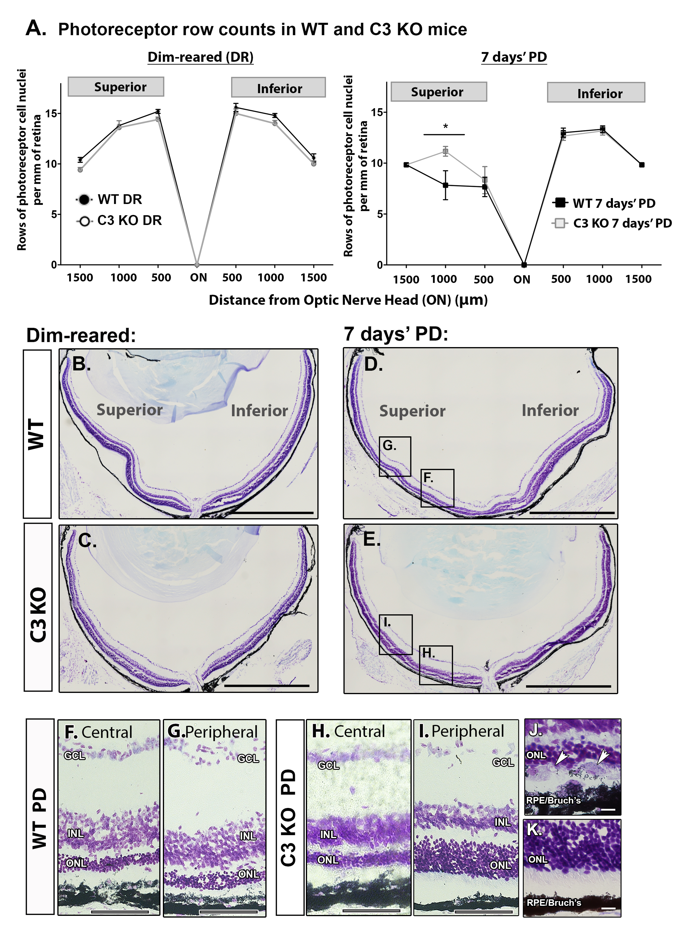 mice (D), in the central (F, about 500 μm eccentricity) and peripheral (G, about 1,000 μm eccentricity) regions of the superior retina. In the C3 KO mice (E), representative images show severe ONL disruption mainly within the central region (H), while the peripheral region was more spared (I). J–K: Higher magnification examinations of WT mice retinas (J) following PD show the incursion of amoeboid cells in the subretinal space (arrowheads) and disruption of the RPE and Bruch’s