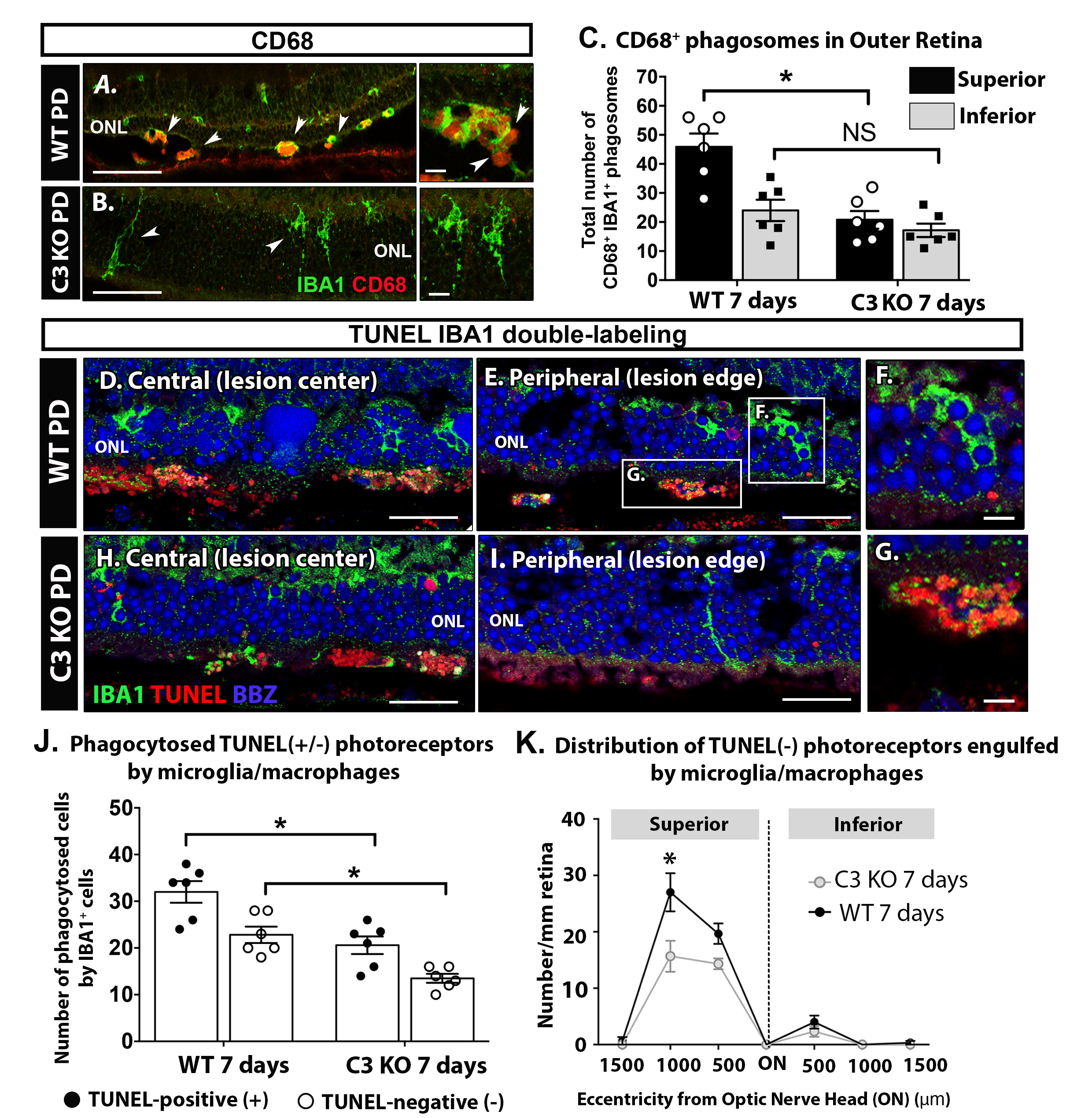 K: Counts of TUNEL-negative/IBA1-positive cells in 500 μm increments across the vertical meridian reveal a peak in the engulfment