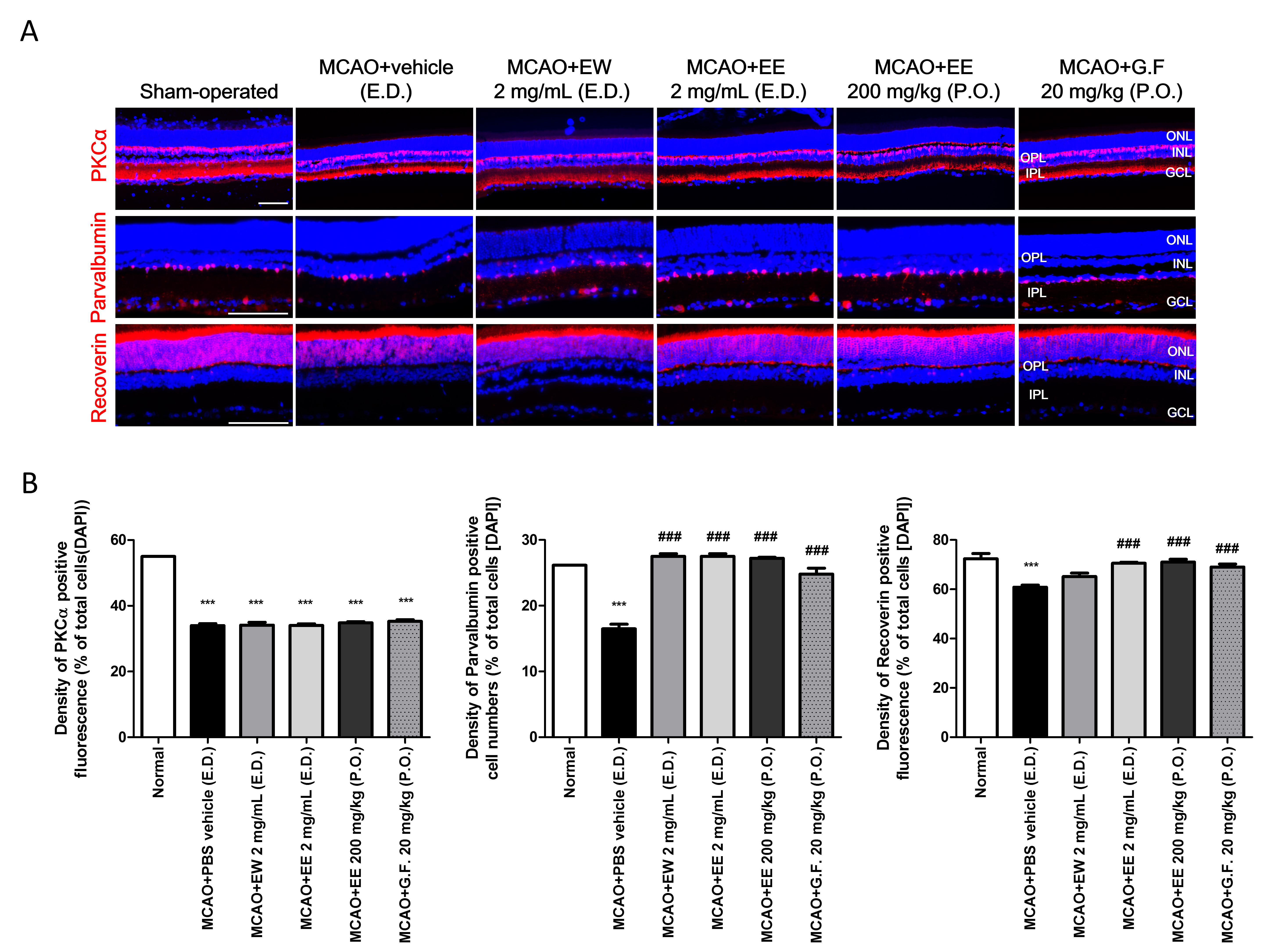 KIOM-2015EW, KIOM-2015EE, or Ginexin-F. Five days after treatment, sectioned retinal tissues underwent immunohistochemistry