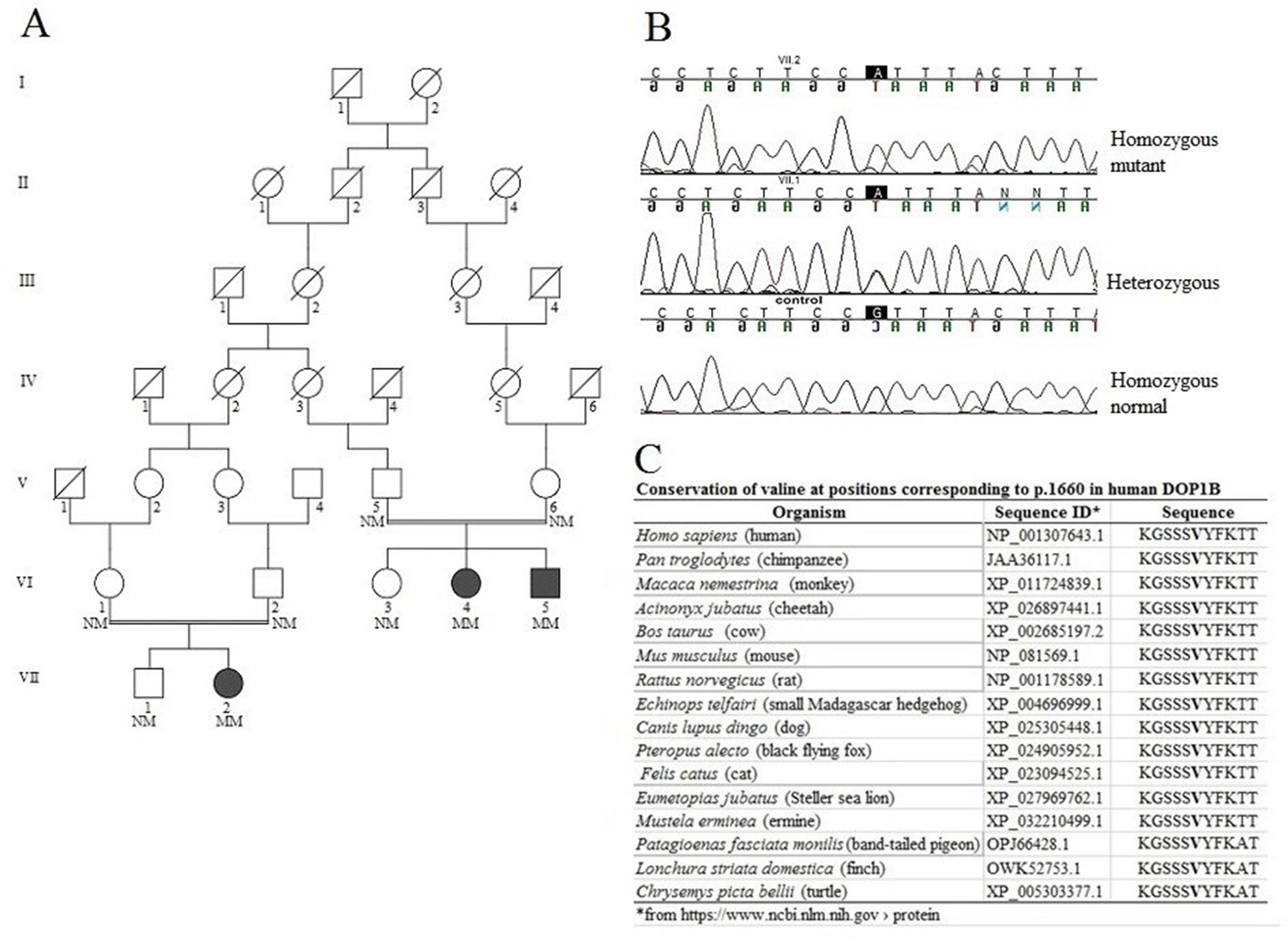 Figure 1. Peters anomaly pedigree PA-101. A: Pedigree PA-101. Filled square and circles: PA-affected. Unfilled shapes: not affected with PA. B: Chromatograms showing homozygous and heterozygous mutation c.4978G>A (p.Val1660Ile) in DOP1B, and the wild-type genotype. C: Amino acid sequence alignments showing conservation of Val at positions corresponding to p.1660 in the human DOP1B-encoded protein in orthologous proteins of other organisms.