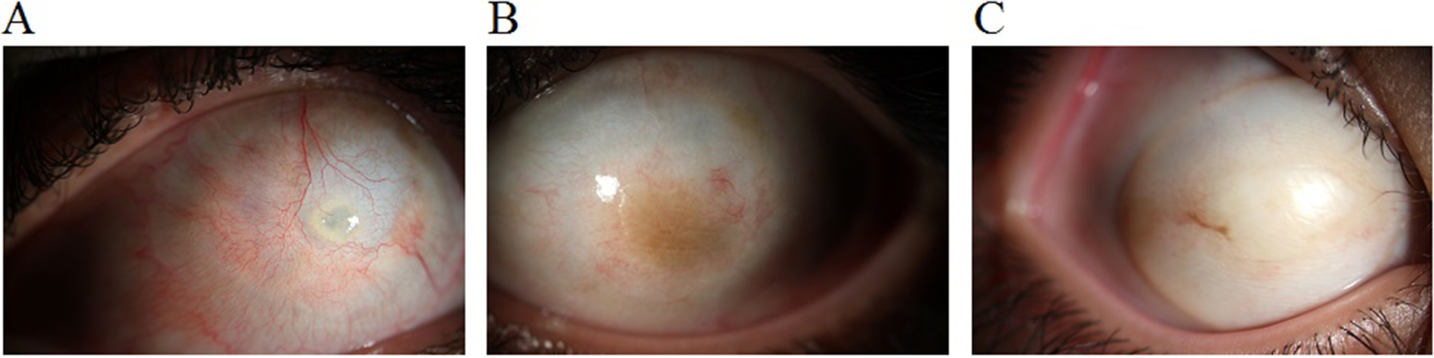Figure 2. Slit-lamp biomicroscopy images show the Peters anomaly. A: PA-101-VI4. B: PA-101-VI5. C: PA-101-VII2. The images of PA-101-VI4 and PA-101-VI5 show total corneal opacity and vascularization. The image of PA-101-VII2