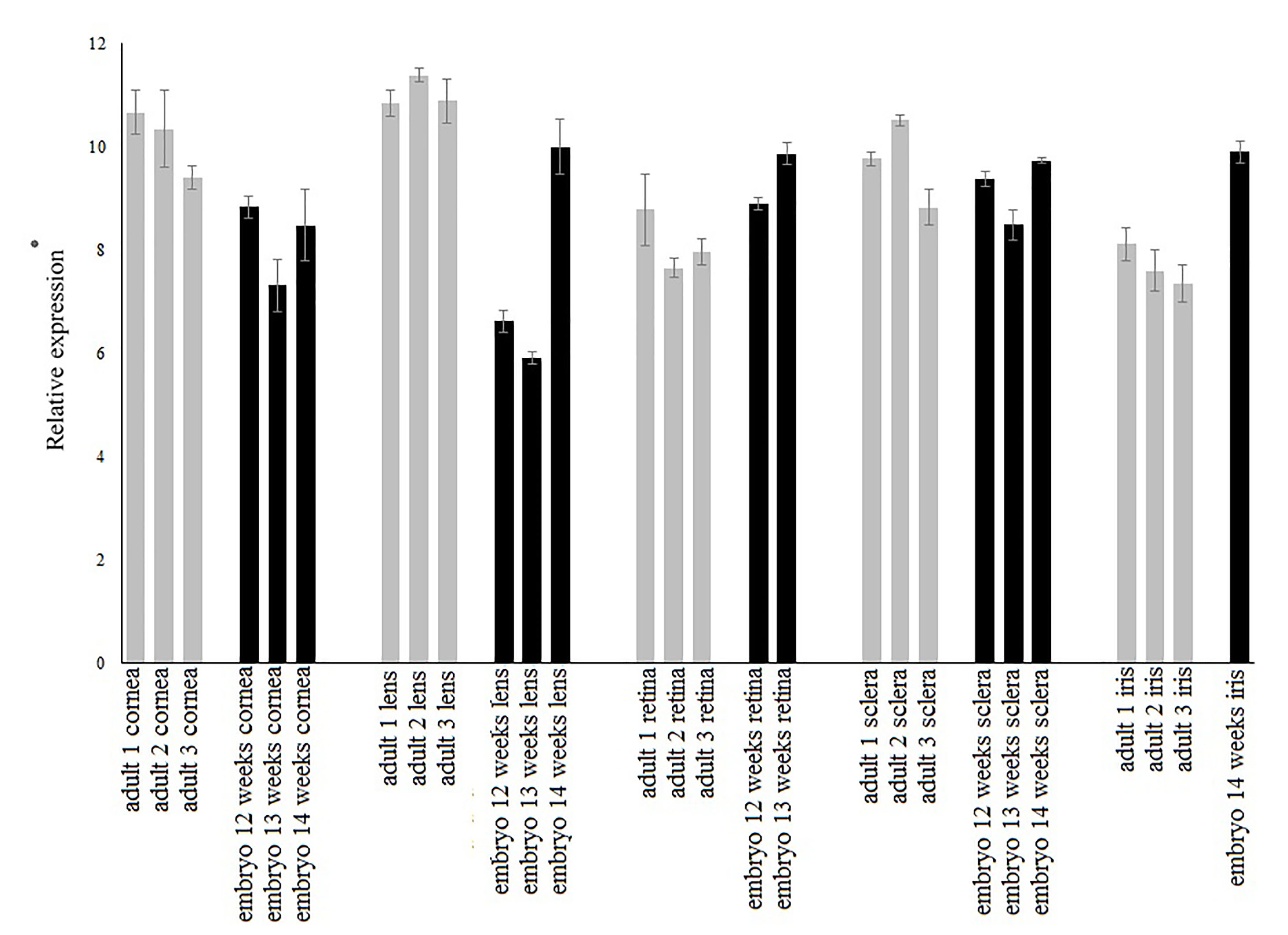 to glyceraldehyde-3-phosphate dehydrogenase (GAPDH) expression. The average threshold cycle (CT) of GAPDH was 16.21. The expression of DOP1B was assessed in the cornea, lens, retina, sclera, and iris tissues of three adult men and three embryos. Standard deviations