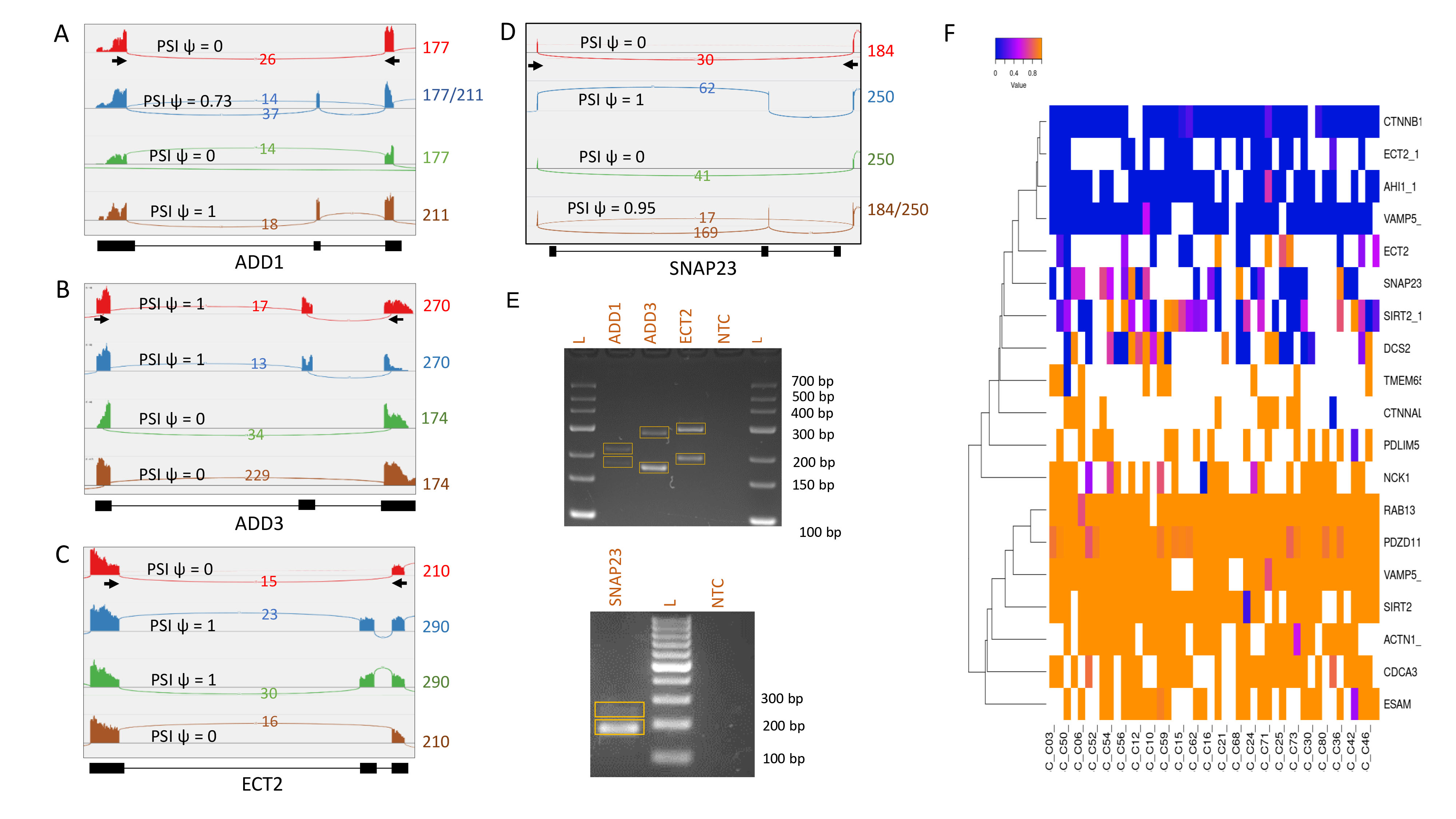 ADD1 (A), ADD3 (B), and ECT2 (C) microvascular barrier genes within four exemplar individual cells. D: The alternative splicing detected in the SNAP23 gene is a novel event not previously reported. Percent spliced in values (PSI ψ) for each event range from 0, indicating