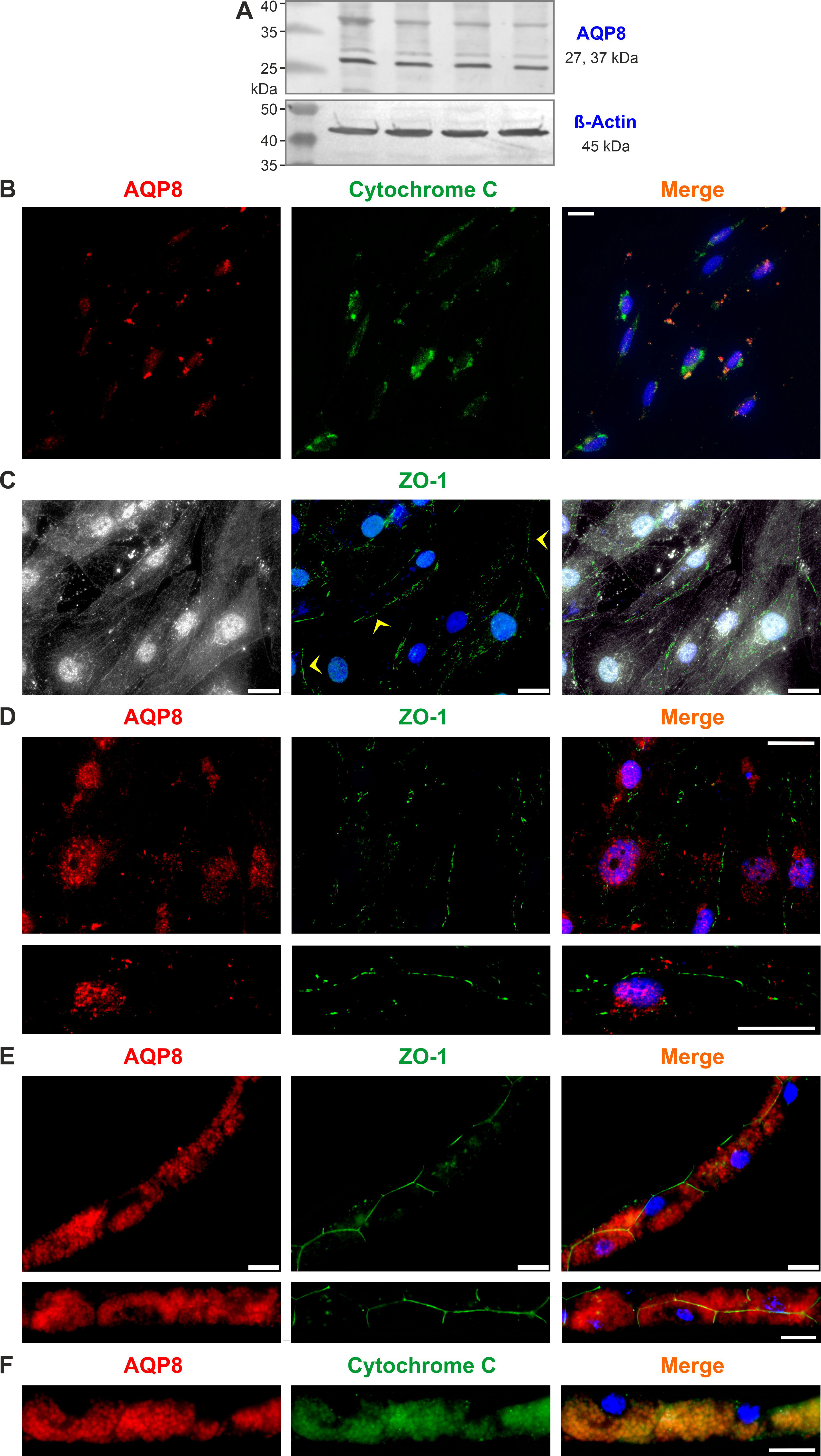 e.g., around 27 and 37 kDa. β-Actin (45 kDa) was used as loading control. B:Double immunolabeling of a cell culture with antibodies against AQP8 (red) and cytochrome c (green). Colocalization of both