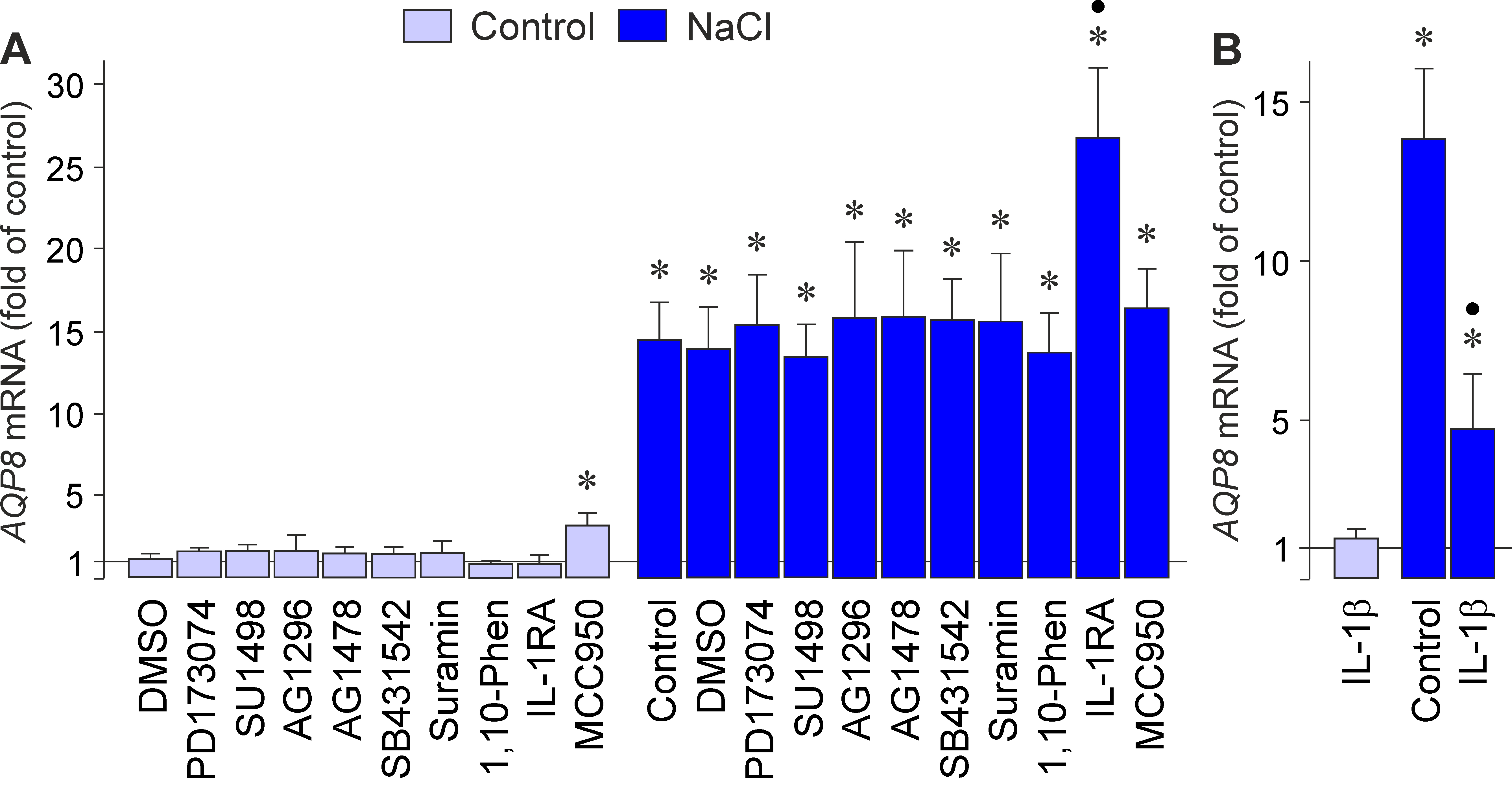 inhibitor MCC950 (1 µM). B: Effect of exogenous IL-1β (10 ng/ml) on AQP8 gene expression. Vehicle control was made with dimethyl sulfoxide (DMSO; 1:500). Each bar represents mean ± standard error