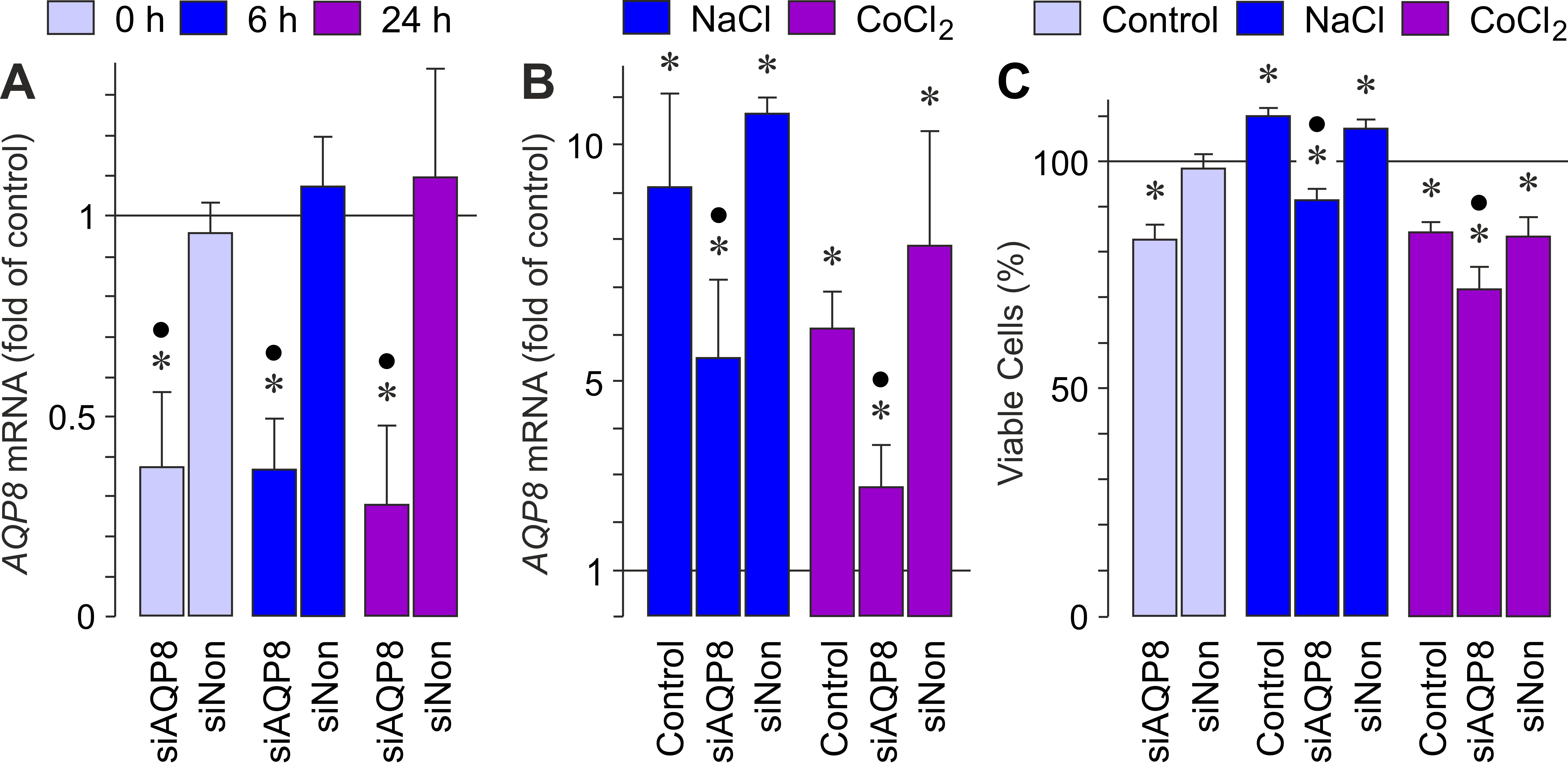 before the addition of 100 mM NaCl or CoCl2 (150 µM). In A and B, the mRNA level is shown as folds of unstimulated control. A: Effects of siAQP8 and siNon on the level of AQP8 mRNA in cells cultured for 0, 6, and 24 h under unstimulated control conditions in serum-free medium. siRNA transfection