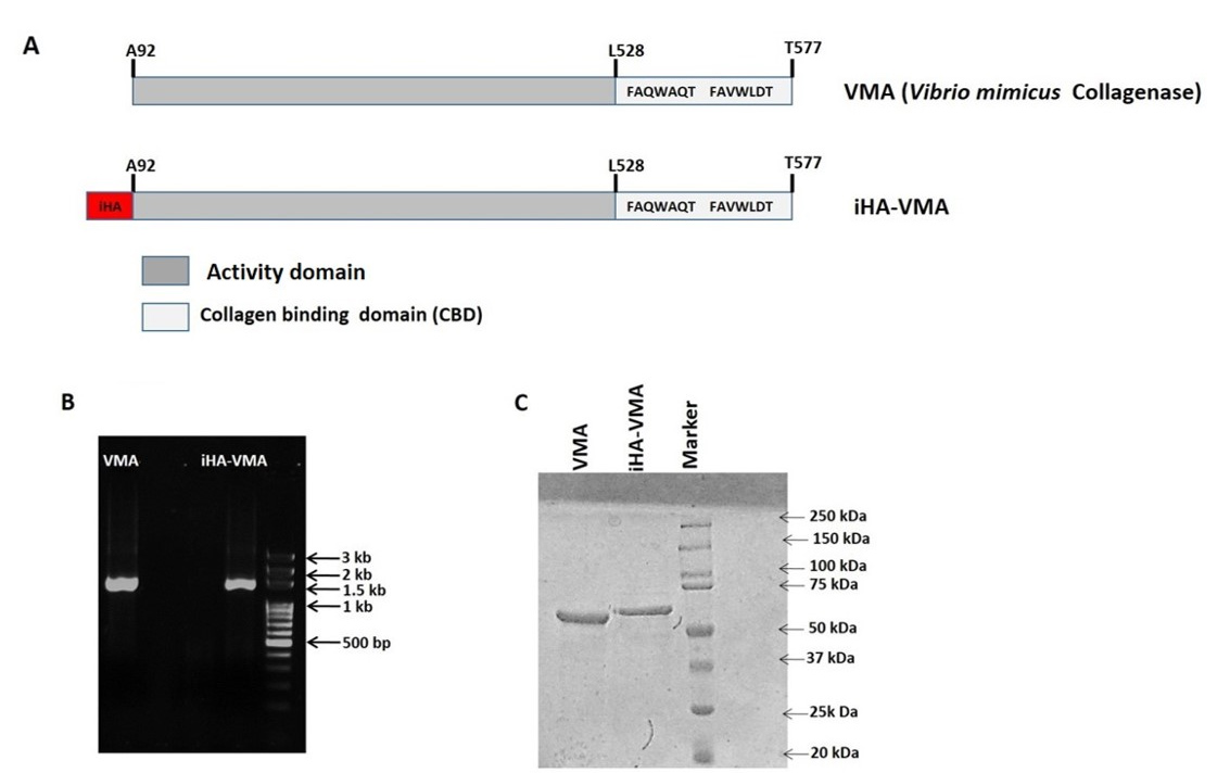Figure 1. Cloning of VMA and iHA-VMA. A: Schematic representation of the constructs, Vibrio mimicus collagenase that remains active (VMA) and inhibitor of hyaluronic acid-VMA (iHA-VMA). B: Agarose gel showing the PCR amplicons (about 1.5 kb) corresponding to iHA-VMA and VMA, respectively, and 100 bp ladder.