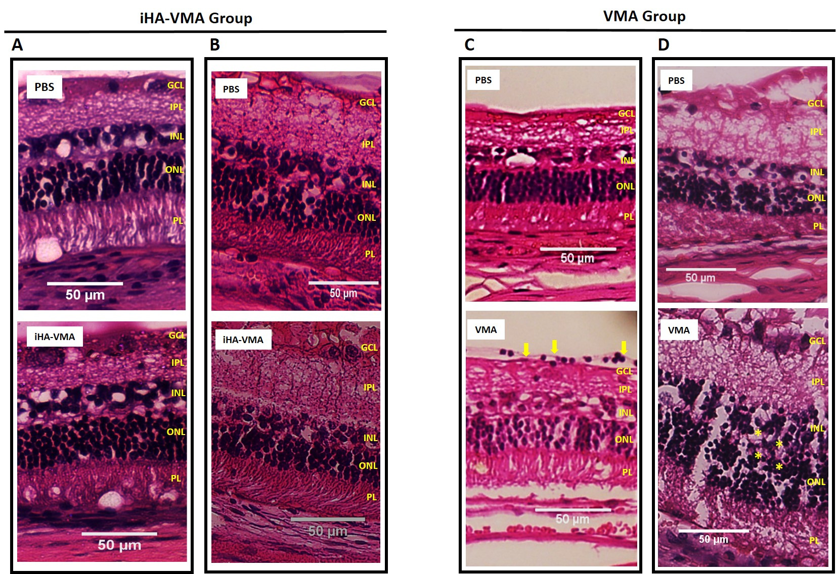 with an intravitreal injection of inhibitor of hyaluronic acid-Vibrio mimicus collagenase that remains active (iHA-VMA) or VMA, post-euthanasia. The retinal morphology of the eyes treated with iHA-VMA