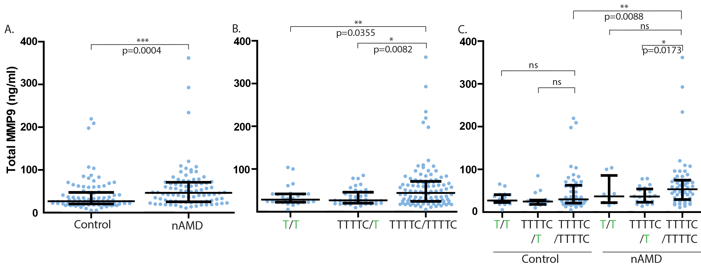 C: Total MMP9 levels in nAMD patients and controls separately and stratified by rs142450006 genotype. The non-risk allele of