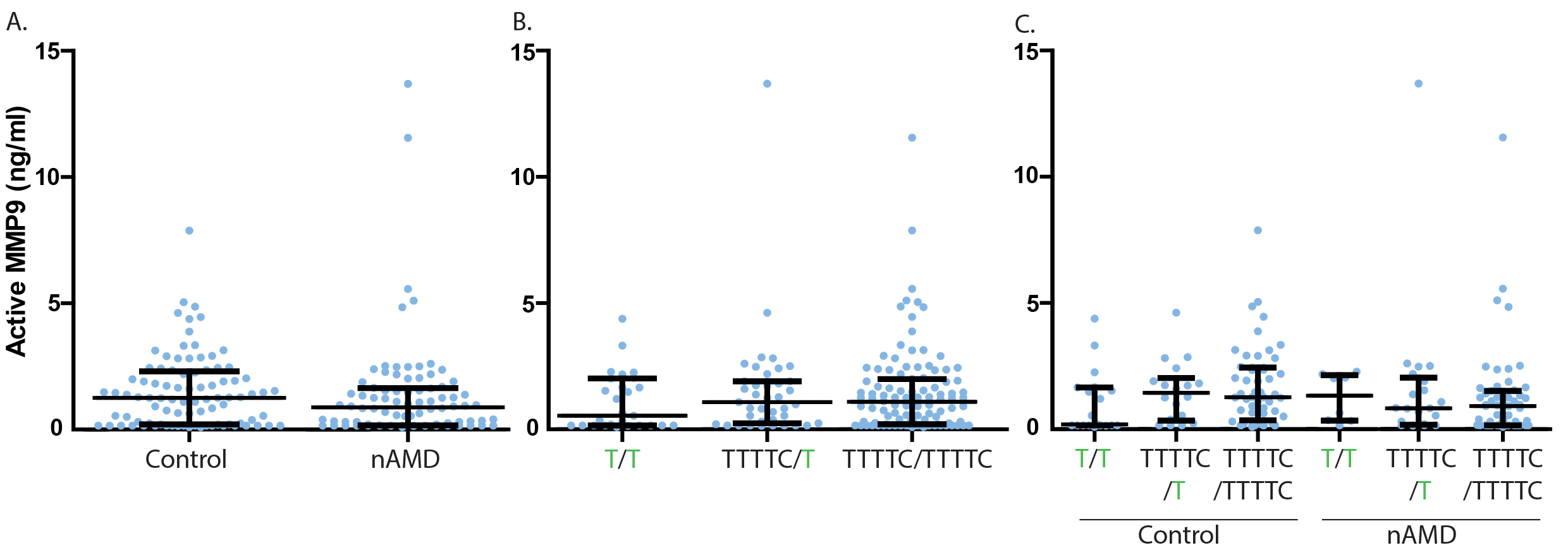 C: Active MMP9 levels in nAMD patients and controls separately and stratified by