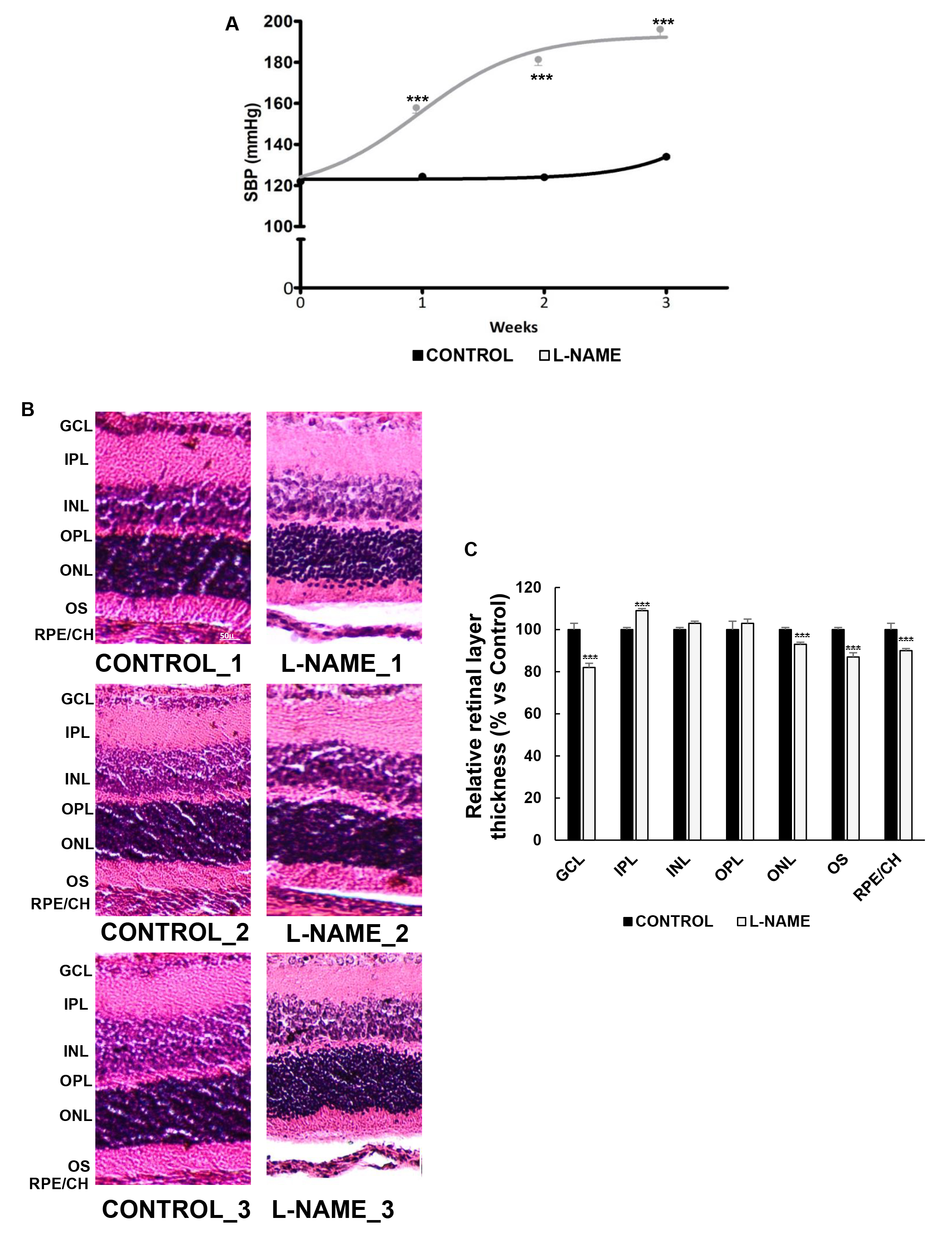 Figure 1. Effect of Nω-nitro-L-arginine methyl ester (L-NAME) on blood pressure and retinal layer thickness. A: Systolic blood pressure (SBP) values of rats receiving the standard control diet (black line) or subjected to treatment