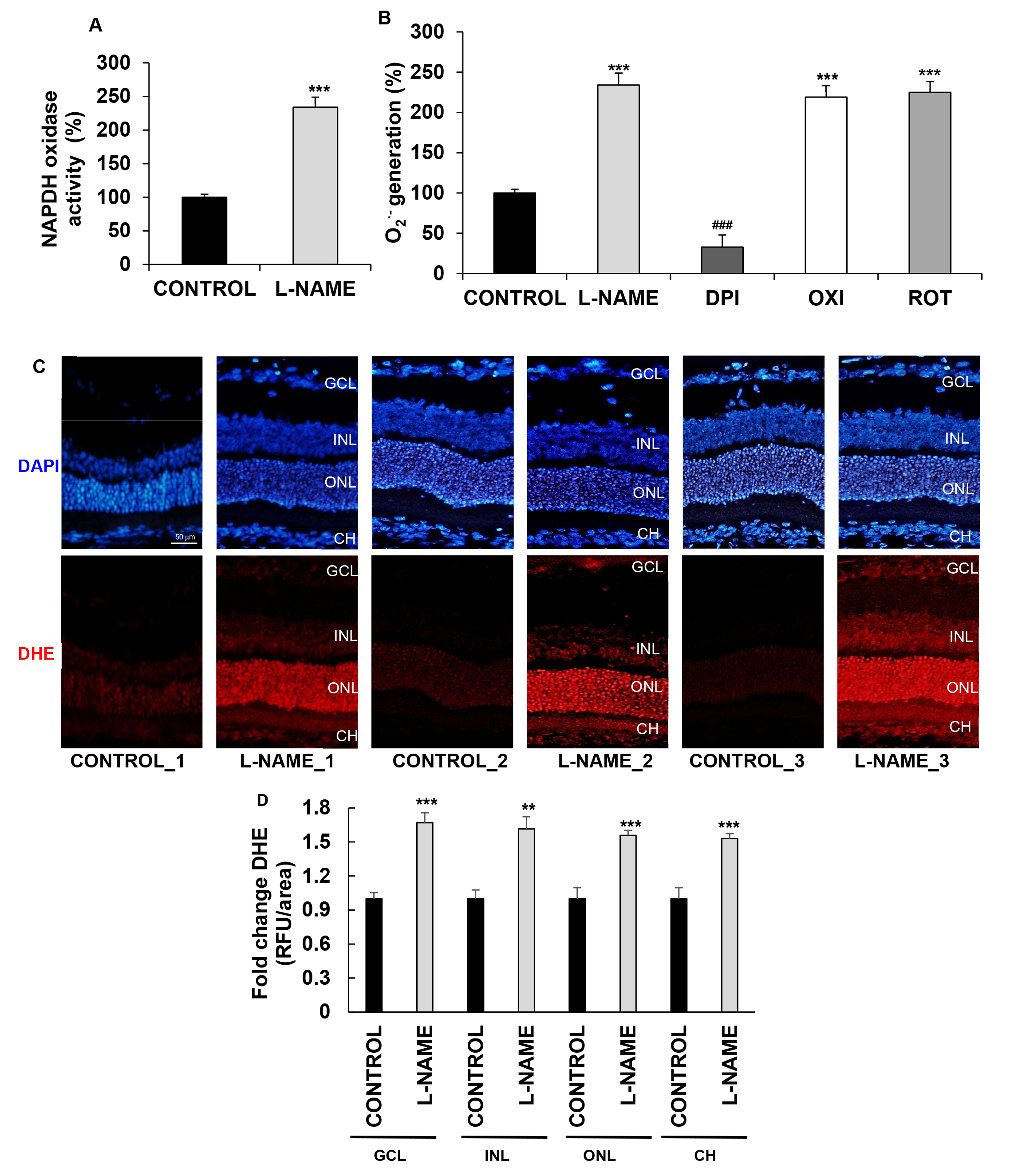 and are expressed as mean ± SEM of seven animals per group. ***p<0.001 versus the CONTROL group; ###p<0.001 versus the L-NAME group. C, D: Estimation of reactive oxygen species (ROS) levels in the retina and choroid with dihydroethidium (DHE) staining. C: DHE labeling (red) for ROS was present in the ganglion cell layer (GCL), in the inner nuclear layer (INL), and in the outer