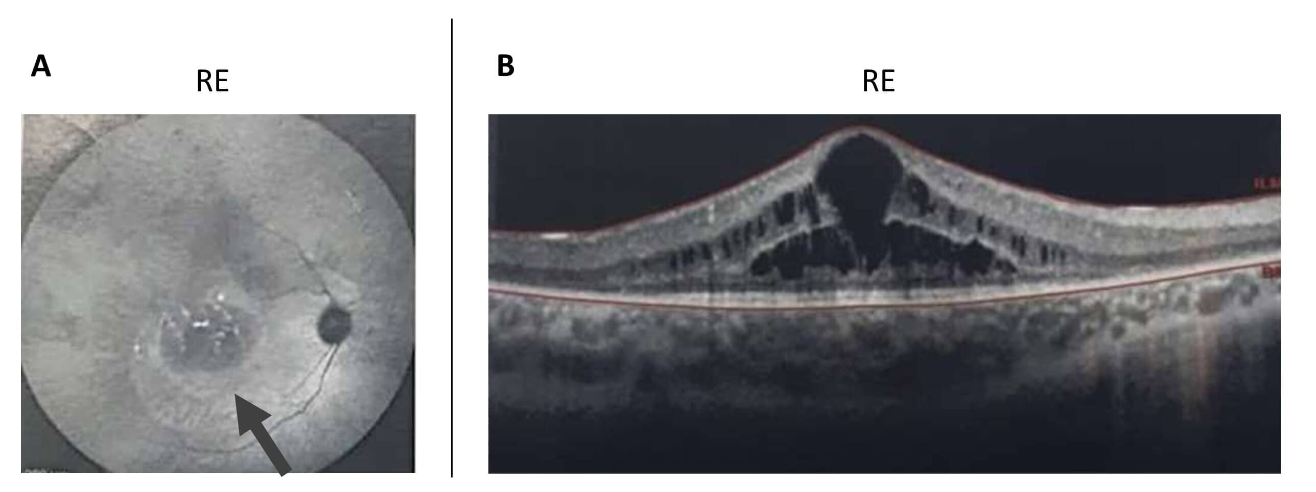 macular area, marked by an arrow, and some hyper-autofluorescence in the inferior area of the optic nerve head. B: Macular optical coherence tomography (OCT) of the RE discloses cystoid macular edema and the loss of the ellipsoid zone