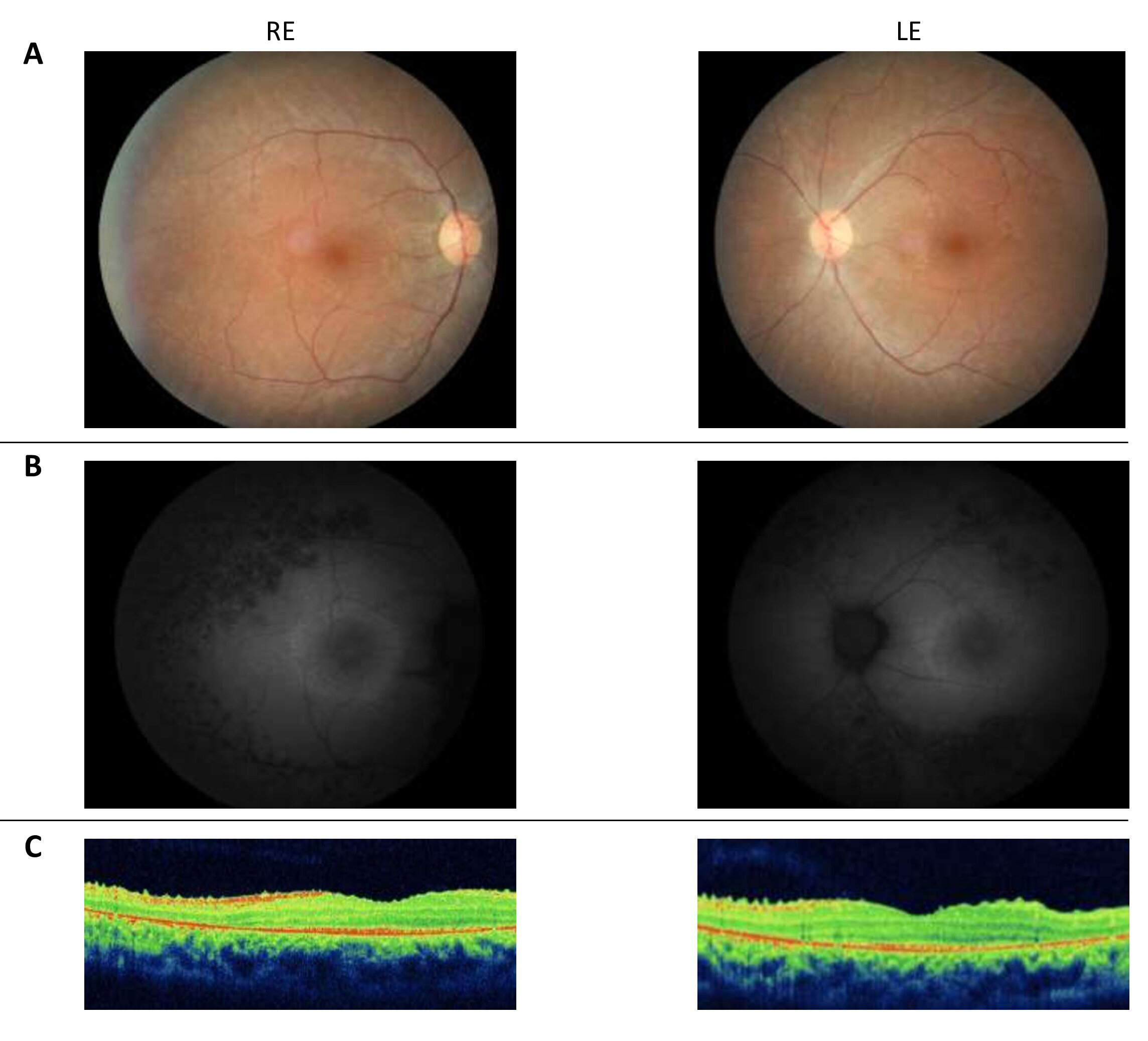 Figure 5. Retinal imaging of patient RP3:03. A: Fundus imaging of patient RP3:03 shows a grayish-white region in the retinal periphery, a slightly pale papilla on the temporal