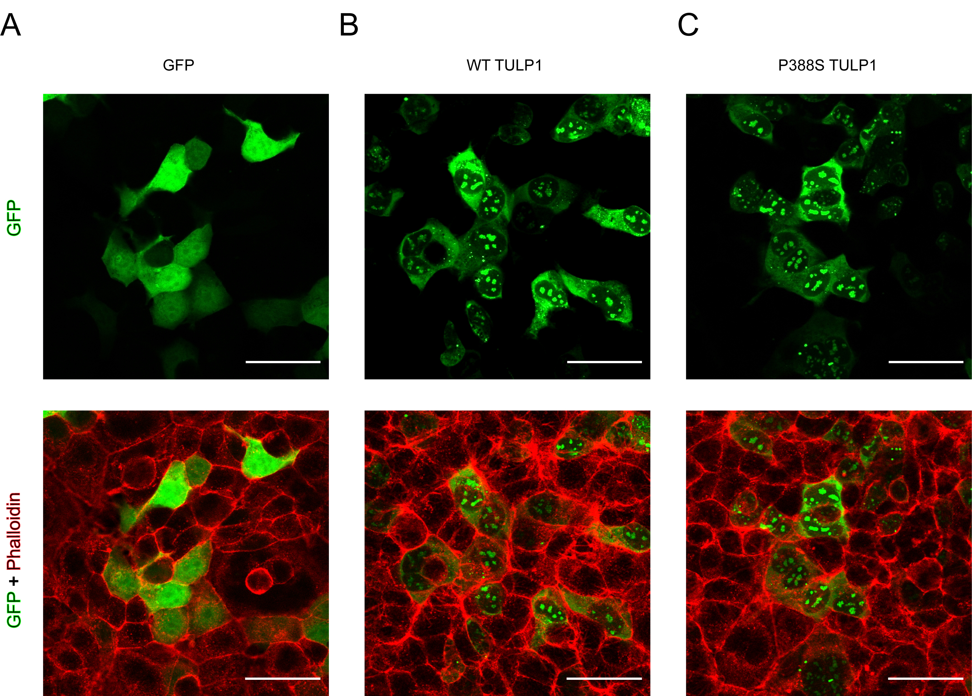 (HEK-293A) cells transfected with (A) green fluorescent protein (peGFP-C1), B: wild-type (WT) TULP1 enhanced GFP (eGFP), or (C) P388S TULP1 eGFP constructs (green) and stained with AlexaFluor 633 phalloidin (red). Scale bar = 50 μm. TULP1 eGFP images