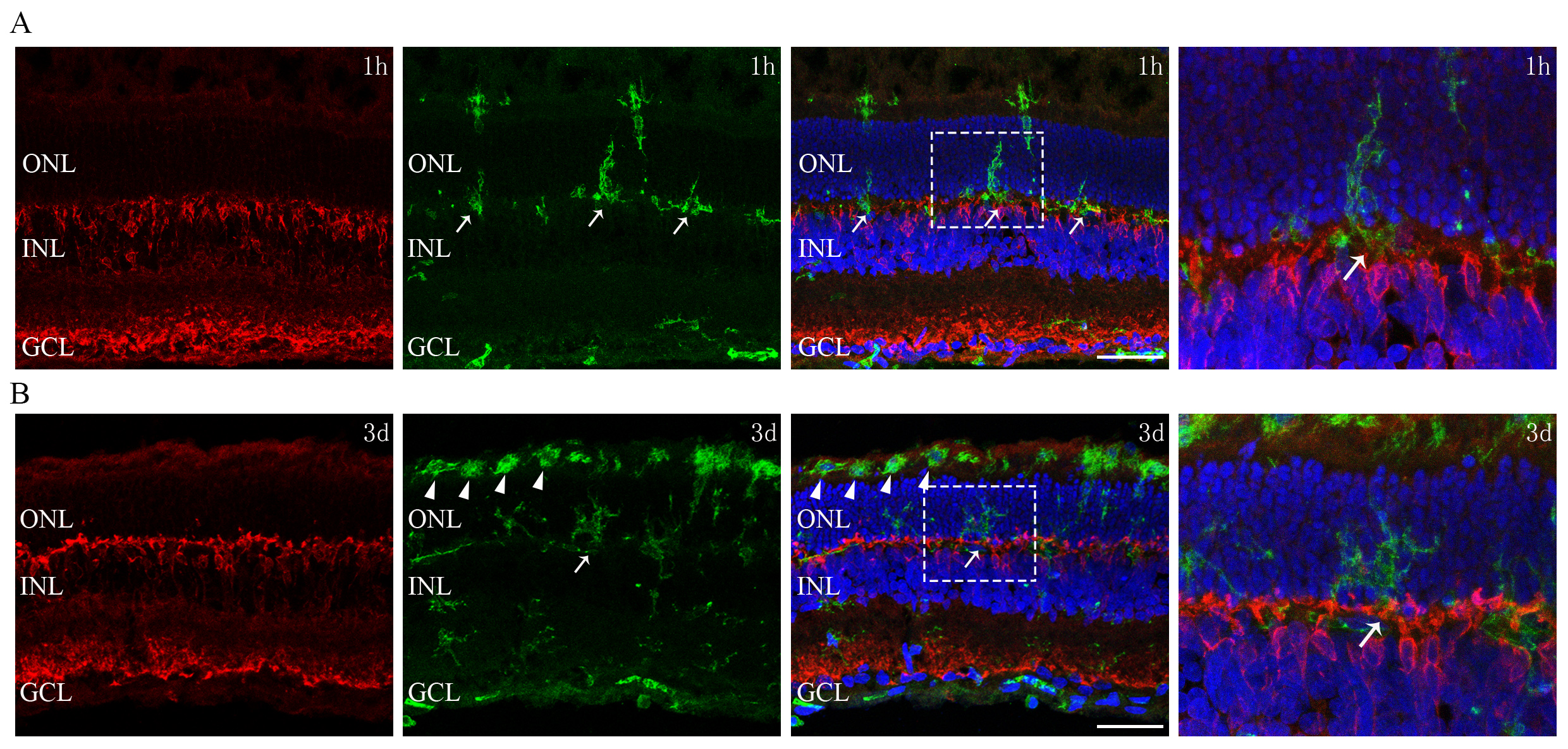(arrow). B: At day 3, some activated microglia are observed in the subretinal space (arrowhead), and tight interaction between microglia