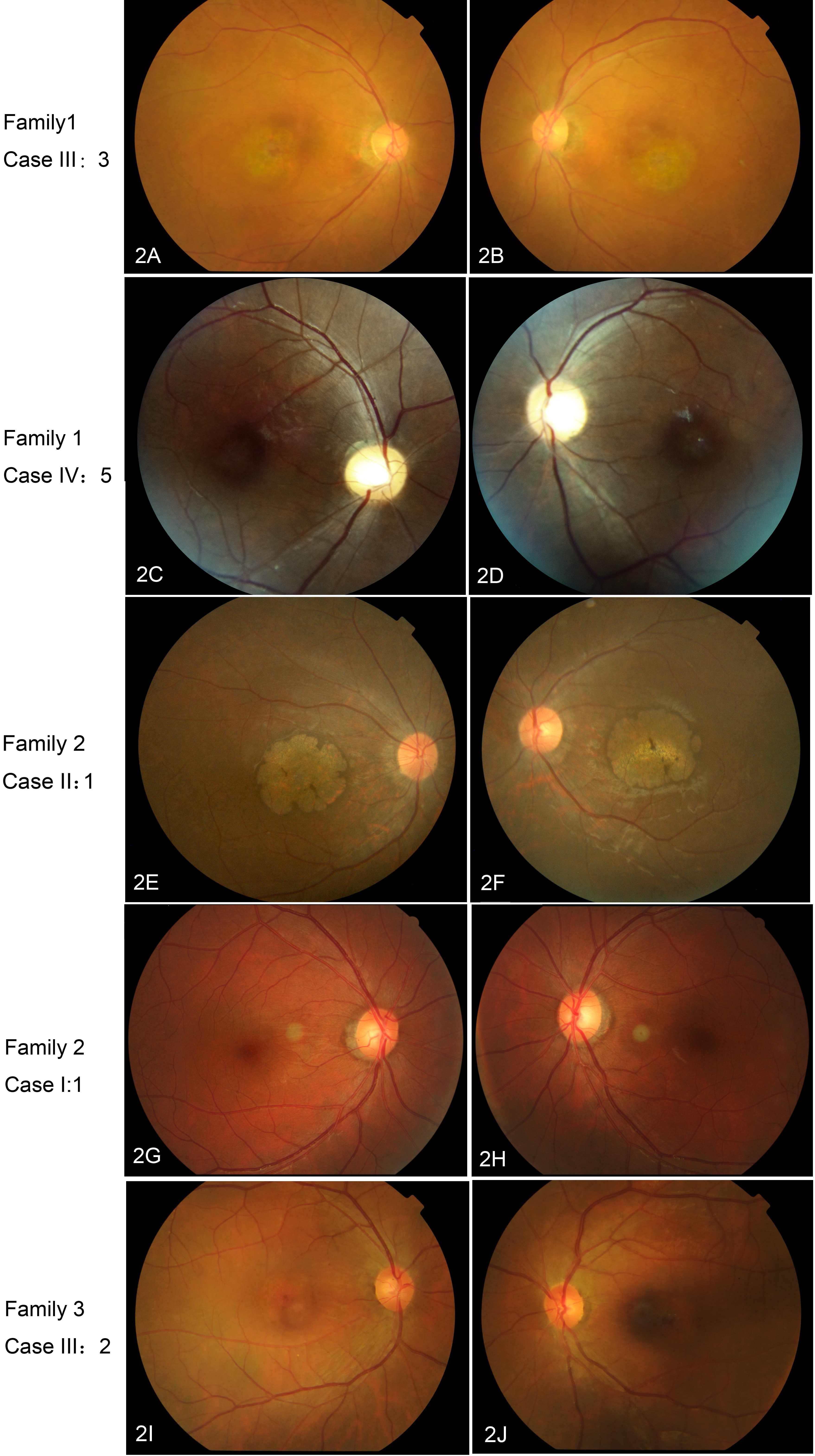normal appearance. I, J: Family 3 Case III:2 is a 32-year-old man. The fundus shows obvious macular atrophy.