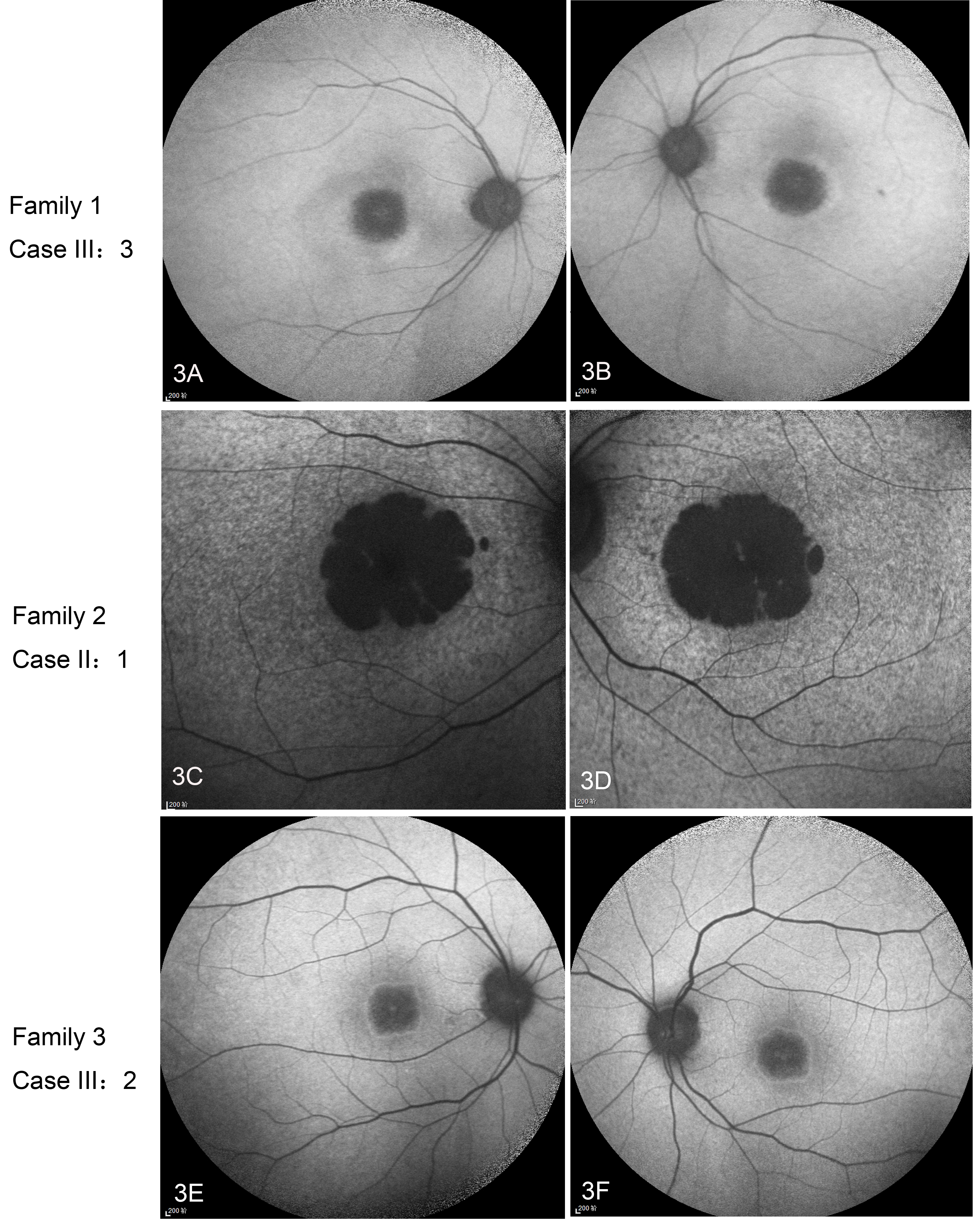 fluorescence in the posterior pole. E, F. Family 3 Case III:2 is a 32-year-old man. AF shows a hypofluorescence patch in the macular area with a surrounding hyperfluorescent