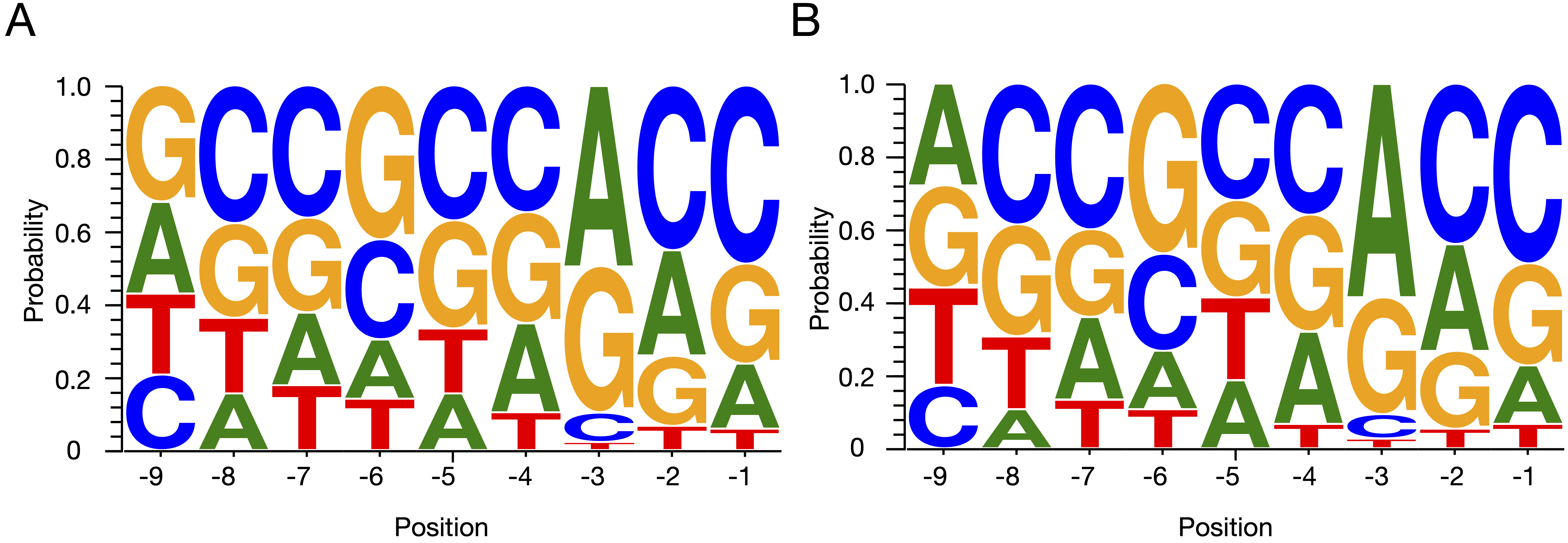 Figure 1. Representations using WebLogo 3.7.4 of nucleotide frequencies at positions −9 to −1 relative to the start codon. A: Following analysis of a 135 inherited retinal disease gene panel. B: Following analysis of a refined 75-gene panel with retina-specific roles.