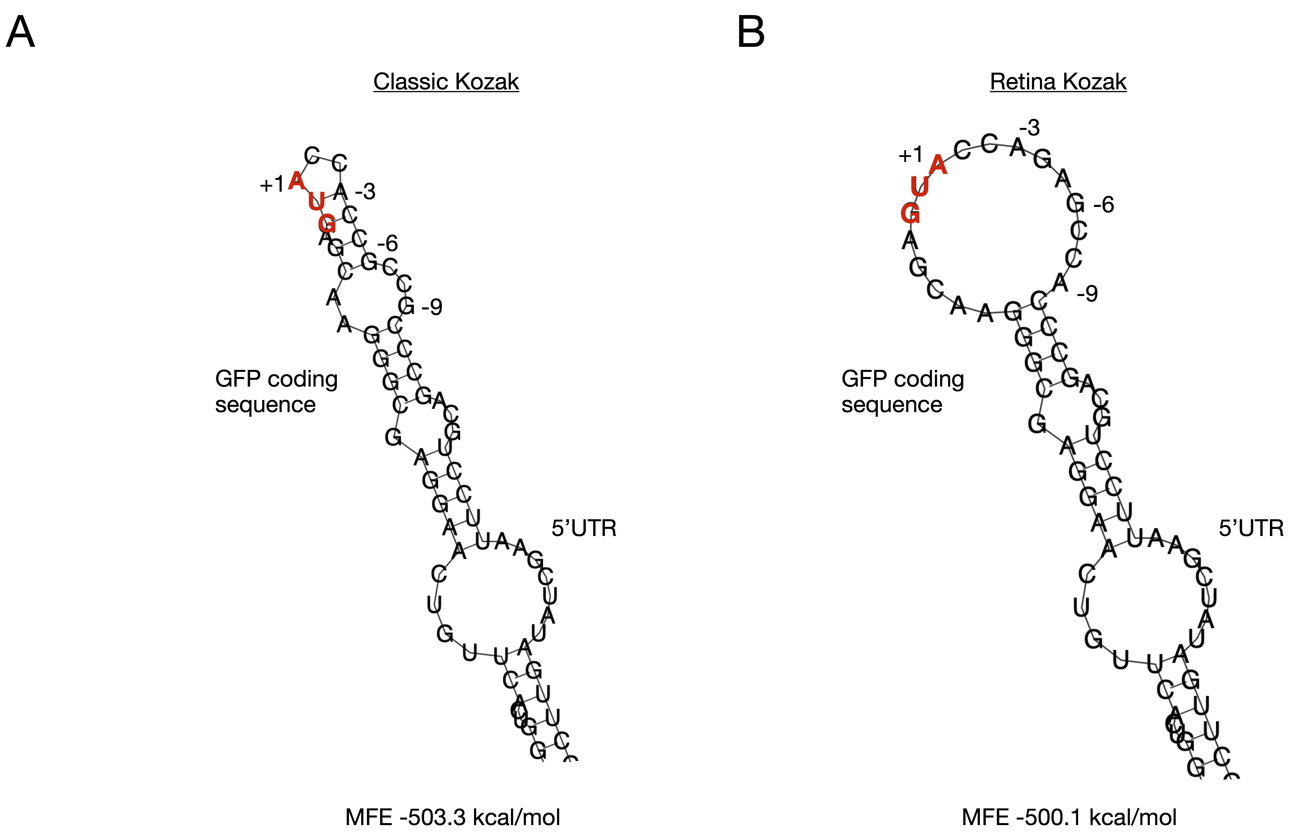 of a standard GFP transcript were performed as follows: A: with the classic Kozak consensus, and B: with the retina-derived Kozak consensus.