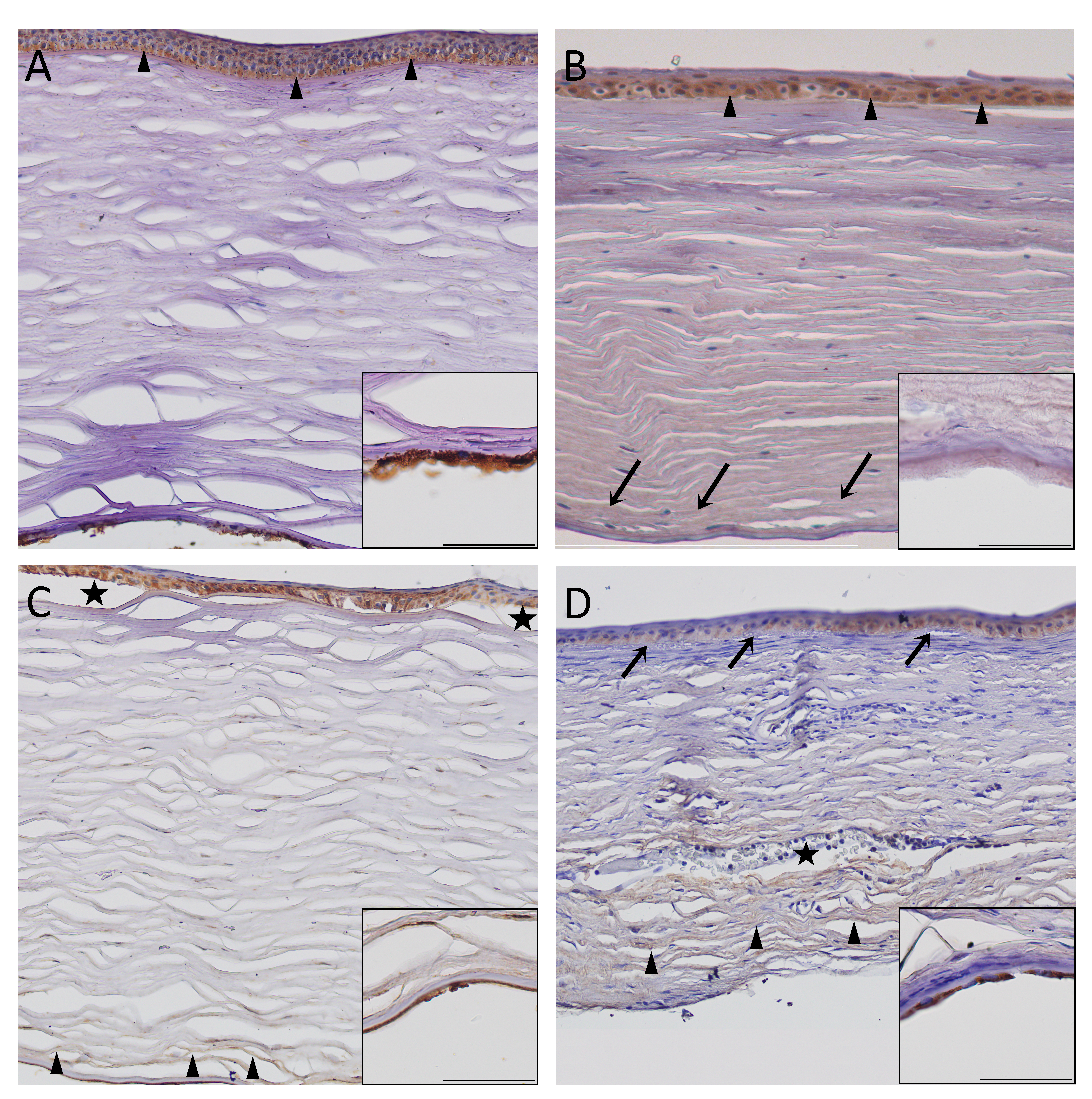 (arrowheads) and moderate in the endothelium (inset). The stroma is immunonegative (A). BK cornea: The epithelial labelling is less pronounced and more evenly distributed (arrowheads) as compared to the control.
