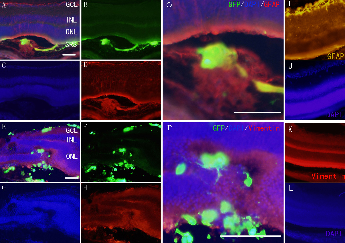 vimentin expressions were seen around the donor cells and the outer nuclear layer. A: Overlay, B: GFP, C: 4,6-diamino-2-phenyl indole (DAPI), D: GFAP, O: high magnification of A. E: Overlay, F: GFP, G: DAPI, H: vimentin, P: high magnification of E. Control image: I: GFAP, J: DAPI, K: vimentin, L: DAPI. Scale bar: 50 um (D, H). Abbreviations: GCL, ganglion cell layer; INL, inner nuclear layer; ONL, outer nuclear layer;