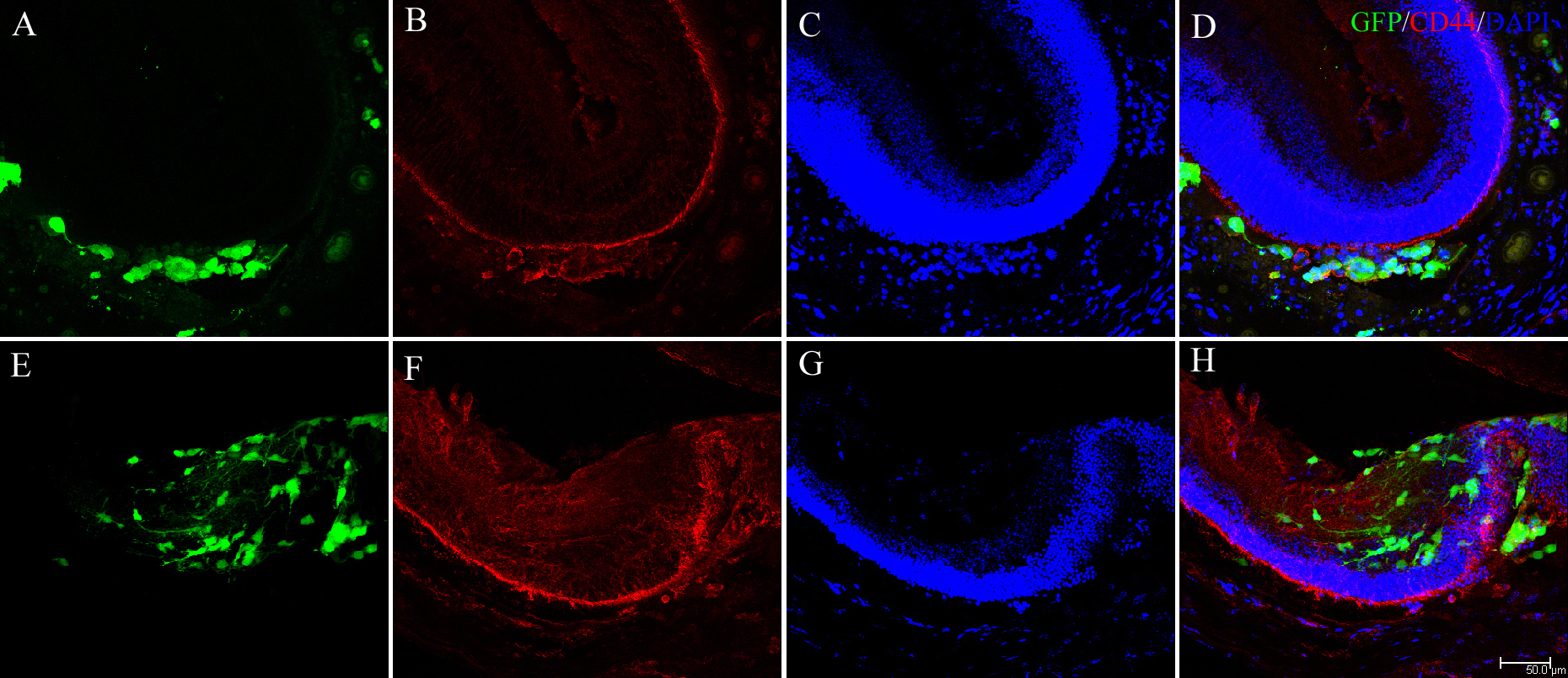 with chondroitinase ABC than in the mRPC group. A: GFP, B: CD44, C: DAPI, D: Overlay. A-D are from the group transplanted with mRPCs only. E: GFP, F: CD44, G: DAPI, H: Overlay. E-H are from the group transplanted with mRPCs combined with chondroitinase ABC. Scale bar: 50 um (D, H). Abbreviations: