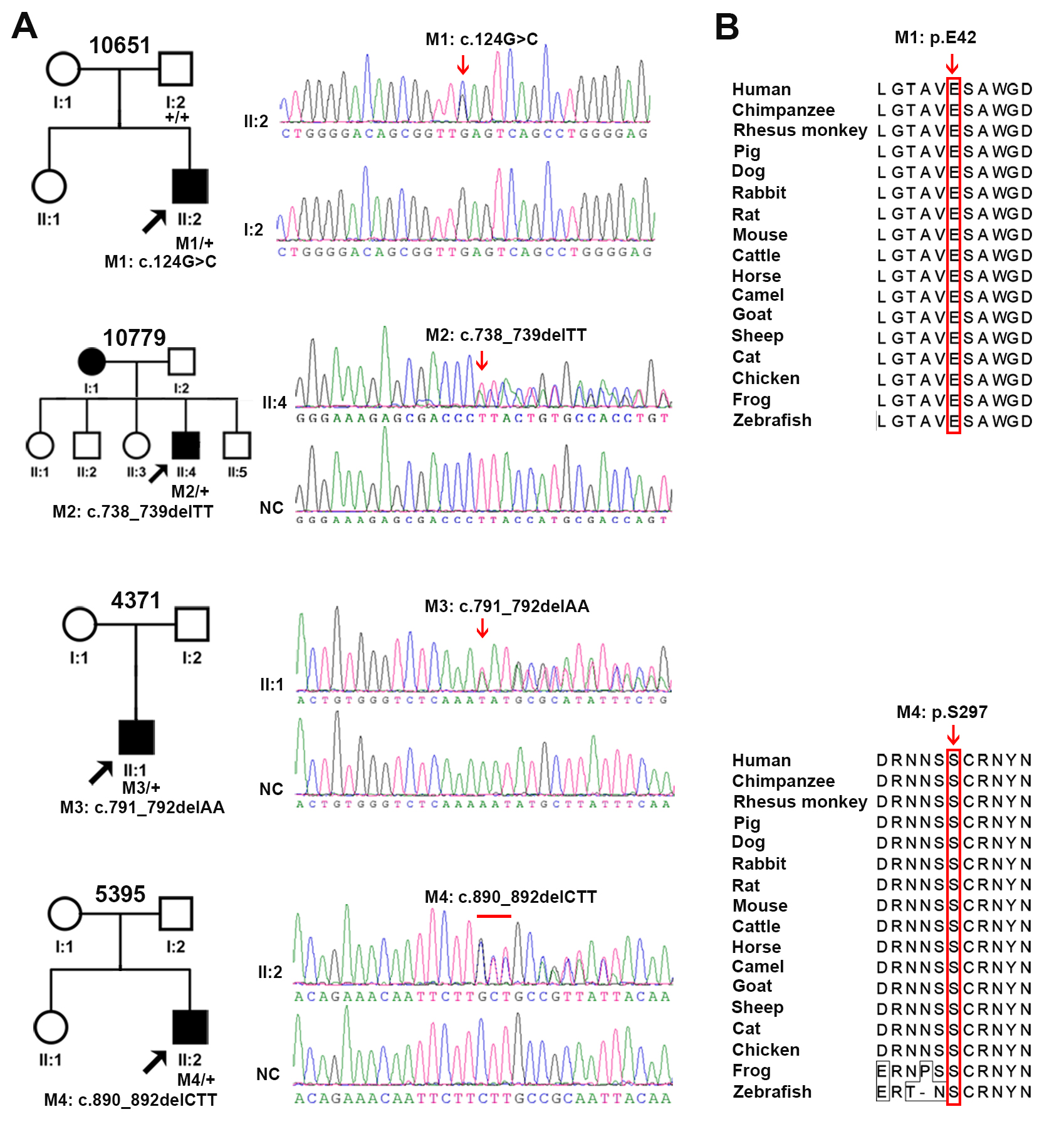 Figure 1. The pedigree and sequence chromatograms of the four probands with PPVs in GJA1. A, B: Mx, mutant allele. Filled squares (male) or circles (female) represent these affected individuals, and the arrow indicates