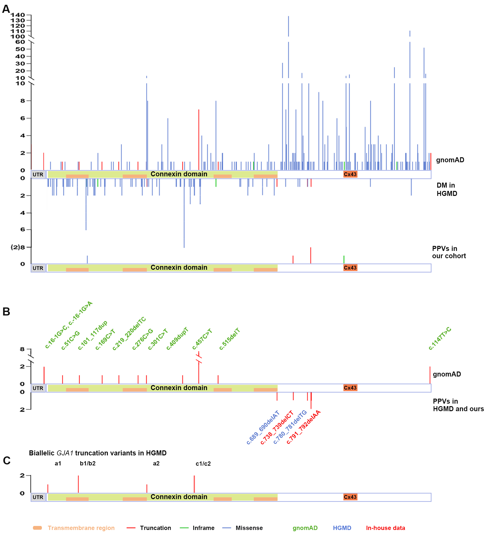 Figure 2. The distribution and allele count of heterozygous GJA1 variants identified in the general population in the gnomAD database, DMs in HGMD, and PPVs from in-house exome sequencing