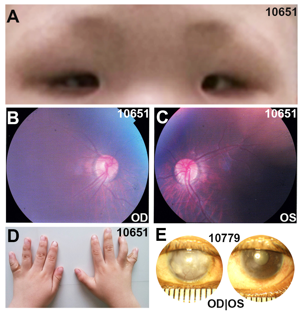 tessellated retina. D: The fourth and fifth fingers of both hands had previously been surgically released. E: Corneal staphyloma appeared in the right eye of proband 10,779-II:4, and bilateral microcornea and cornea opacities were