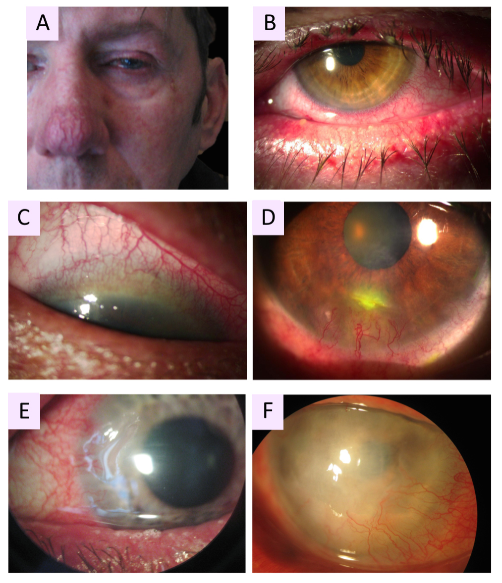 with newly formed stromal vessels. F: Advanced stage of ocular rosacea with white corneal infiltrates and whole corneal neovascularization, including the visual