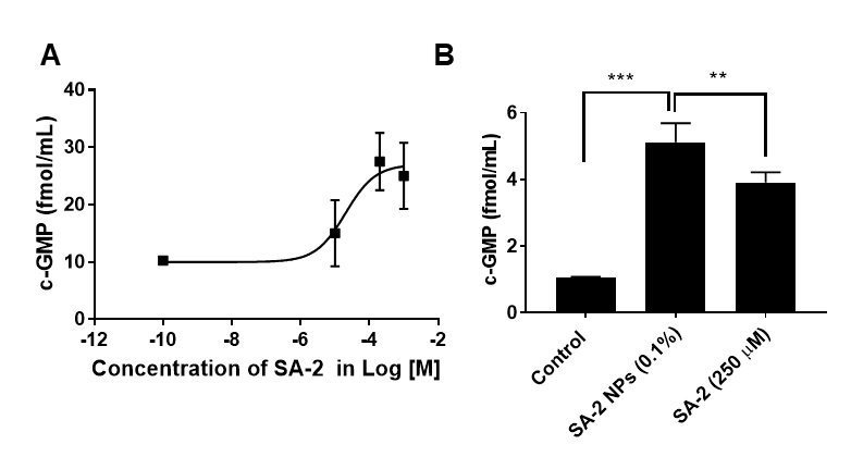 instructions. The EC50 was calculated to be 20.3 µM using GraphPad Prism 7.0. B: SA-2 NPs (0.1% equivalent to 250 µM of SA-2) increased cGMP in hTM cells. *p<0.05, ***p<0.001, unpaired t test. Experiments were performed in triplicate with n = 4 technical replicates. The results showed that SA-2 and SA-2 NPs