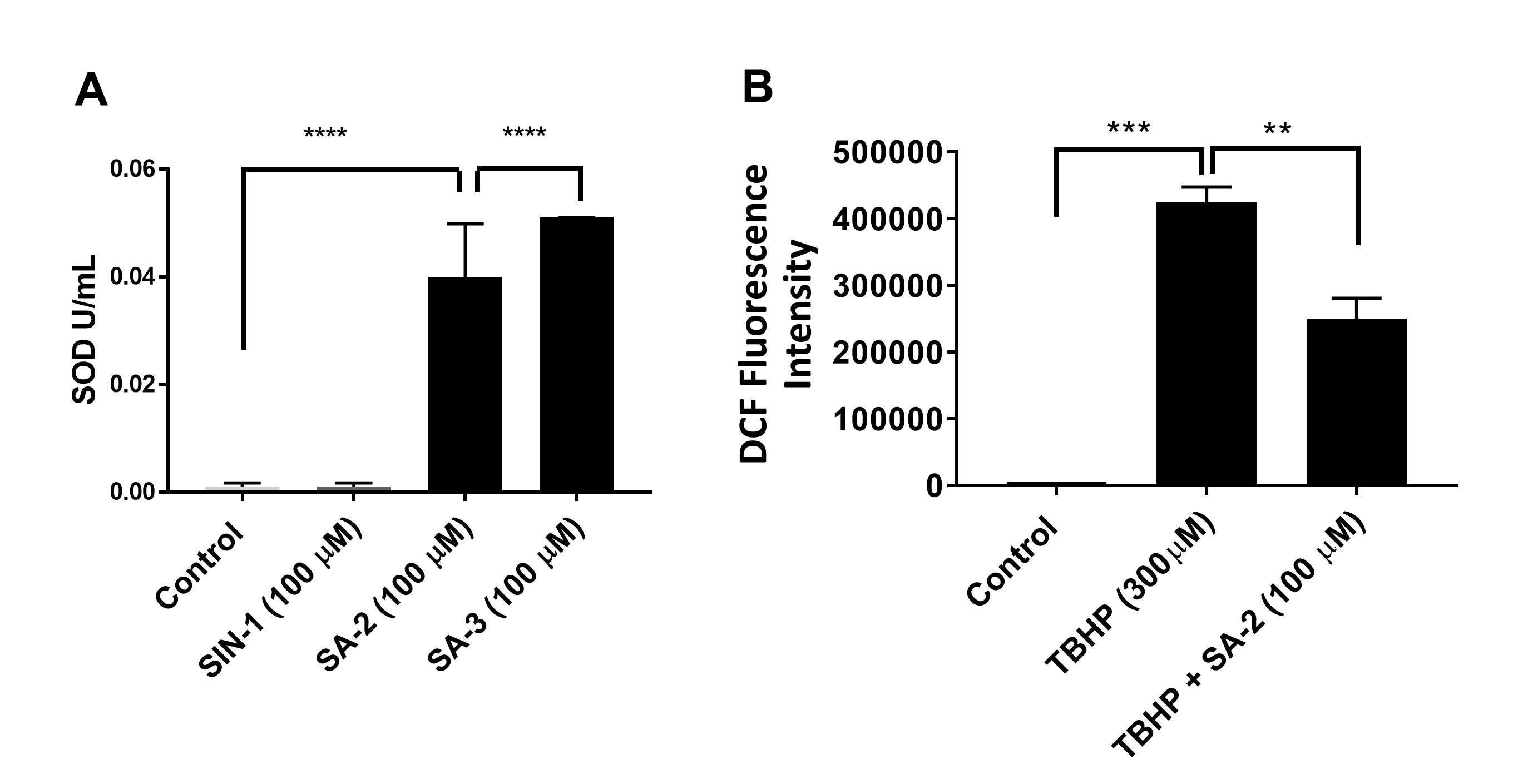 and did not increase the SOD enzyme in hTM-80 cells (as expected) after 24 h. B: SA-2 decreased the reactive oxygen species (ROS) level in hTM cells observed after 1 h. *p<0.01, **p = 0.0072, ***p = 0.0005,